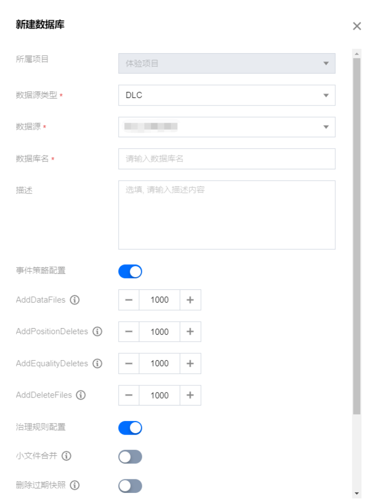 治理规则配置 | 小文件合并 | 启用后大量小于阈值的数据文件将被合并为更大的文件,减少文件数量,提升查询性能。 |