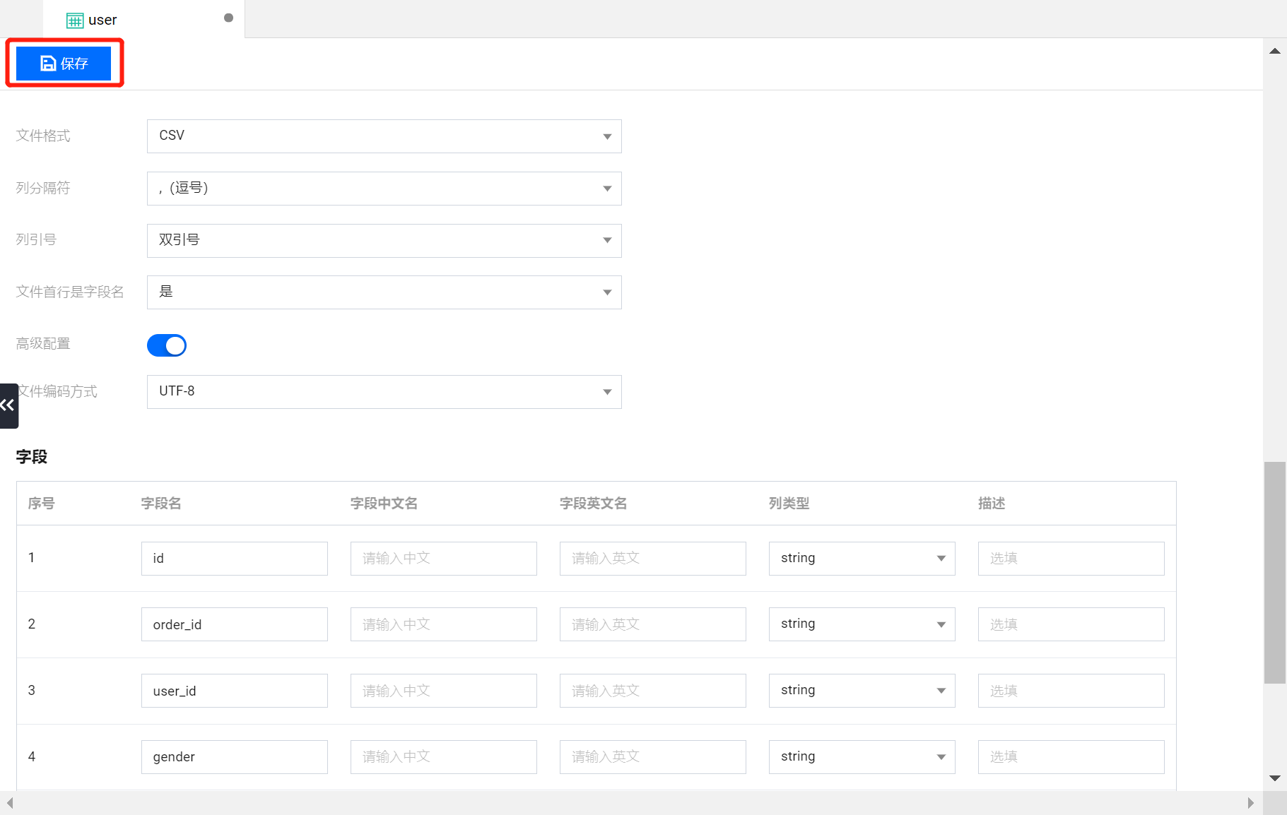 字段属性 | 字段名 | 根据文件首行是字段名属性解析字段名。当文件内数据首行非字段名的情况下,用 column_1、column_2、column_3......column_x 来顺序填充字段名。支持用户可自定义修改字段名。 |