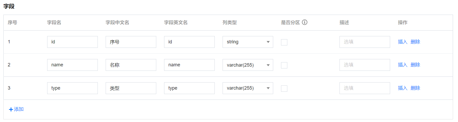 字段配置 | 一个字段包含字段名、字段描述、列类型、是否分区等配置信息。 分区字段说明:字段不能全选为分区字段,至少要有一个非分区字段。分区字段不支持array、map、decimal类型。 |
