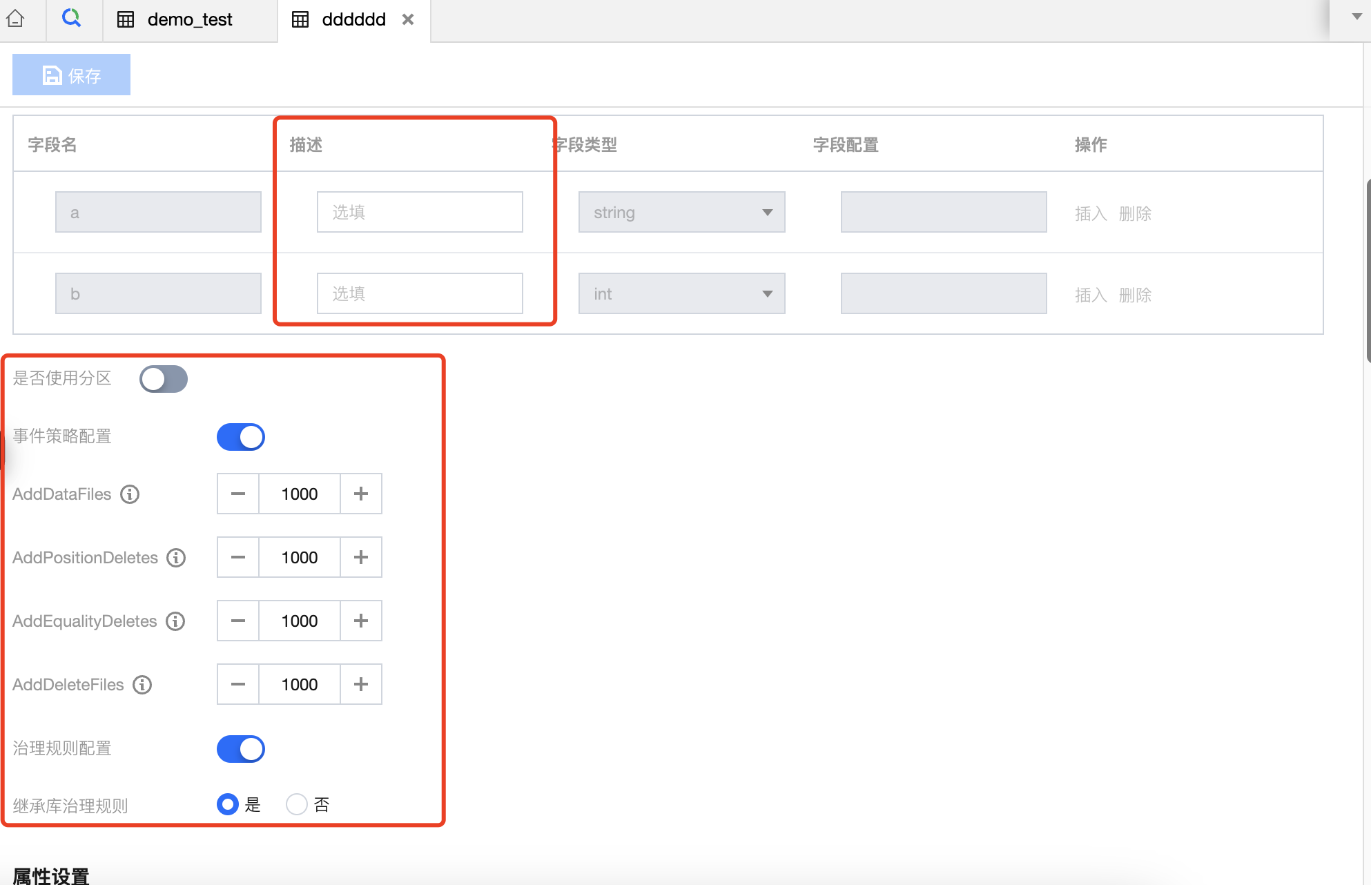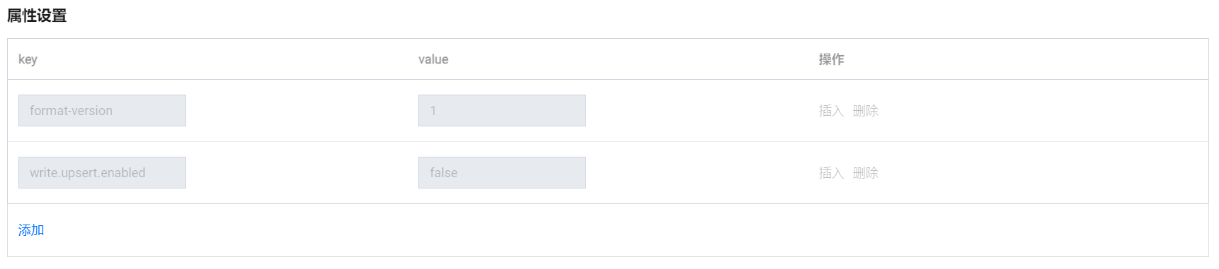 属性设置 | 参数配置 | 支持自定义数据表参数配置,例如 format-version、write.upsert.enabled。 ![]() |