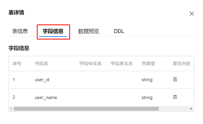 建表方式 | 向导模式 使用传统的手动添加字段,插入字段后自定义字段名、字段中文名、字段英文名、列类型、是否分区、描述。 ![]() DDL 模式 使用 SQL 建表语句创建数据表,新建表仅支持 CREATE TABLE 语句,编辑表仅支持 ALTER TABLE ADD / REPLACE COLUMNS 语句。例: