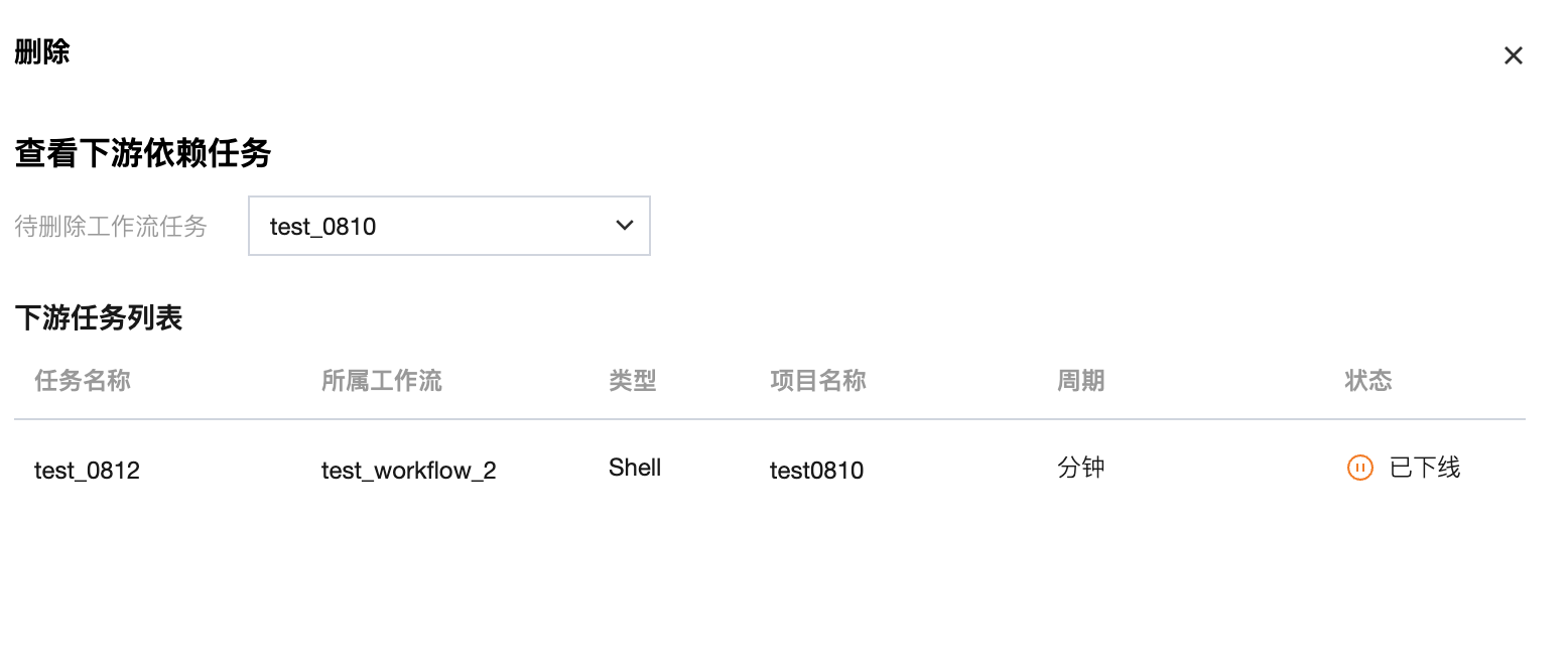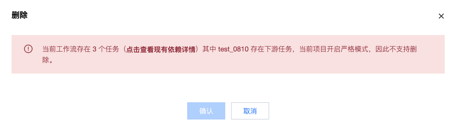 删除工作流 | 若待删除的工作流还有其他工作流的下游任务,会弹出窗口提示无法删除工作流。 ![]() 点击查看现有依赖详情,可以查看具体依赖工作流和任务。 ![]() |