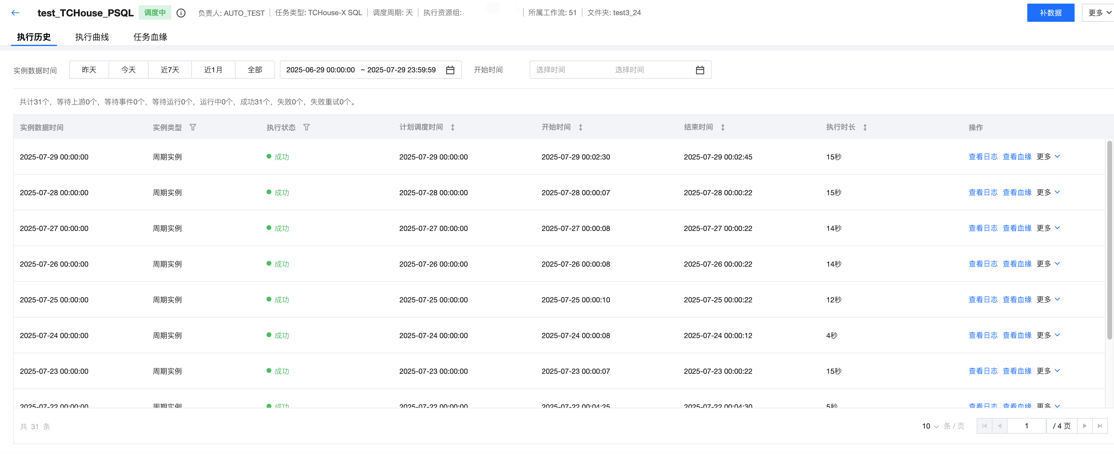 执行历史 | 展示任务历史实例的基本情况。 筛选:支持按实例数据时间、开始时间筛选实例。 统计:统计筛选范围内实例总数,即各状态(等待上游、等待事件、等待运行、运行中、成功、失败)的实例数量。 实例列表:展示实例基本信息及操作。 ![]() |