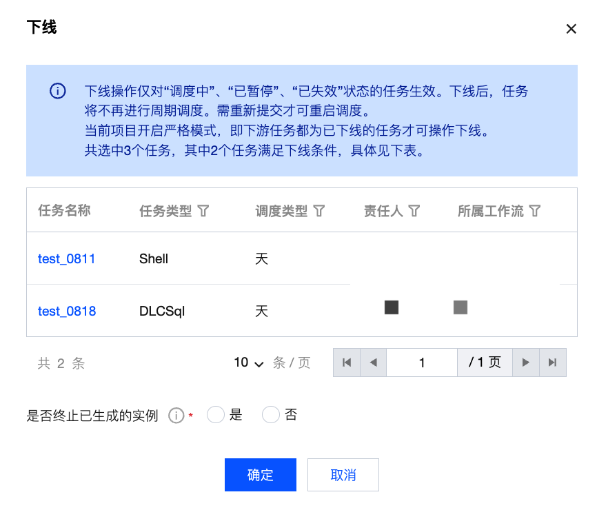 下线工作流 | 下线工作流只会对不存在非“已下线”状态的下游任务依赖的任务生效,在弹出对话框中可以查看允许操作的任务,可以查看任务名称、任务类型、调度类型、责任人、所属工作流等相关信息。 ![]() |