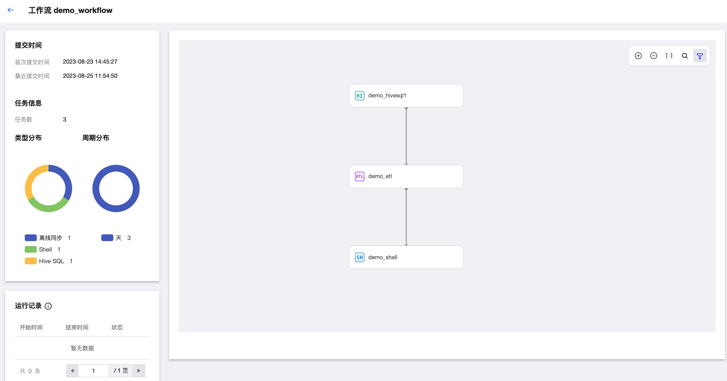工作流名称 | 显示工作流的名称与 ID,单击 ![]() ![]() 提交时间:显示当前工作流首次提交运维与最近一次提交运维的日期时间,格式为:yyyy-MM-dd HH:mm:ss。 任务信息:显示当前工作流中参与编排的计算任务节点数量。 类型分布:使用环图表示工作流中各类型的计算任务节点的数量占比。 周期分布:使用环图表示工作流中各类型的计算任务节点的不同调度策略数量占比。 运行记录:展示工作流运行记录(仅工作流下的任务都是同周期时,才展示运行记录)。 DAG 图:显示当前工作流的 DAG 计算节点编排图示,可以查看各计算任务节点的任务类型、节点编排逻辑。光标移动到任务节点上可以查看对应任务节点的任务 ID、项目名称、工作流名称、责任人、任务类型、任务状态、任务周期、调度计划。 DAG 图右上角提供放大、缩小、1:1、定位任务、筛选等功能,便于操作画布。筛选功能支持选择调度中、已暂停、已下线、已失效四种状态,选中后即可在画布上显示对应状态的任务。 |