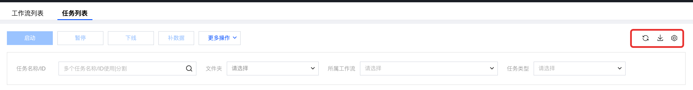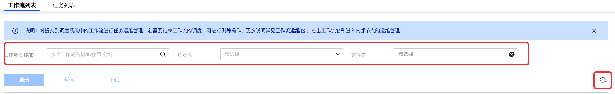 启动 | 在工作流名称前进行勾选,再使用上方的功能按钮,可以批量将选中的工作流执行启动、暂停、下线的调度操作。 启动:仅对任务状态为“已暂停”操作有效。启动工作流后,该工作流中的所有任务都会处于正常运行的状态,并按调度周期生成实例。 暂停:仅对任务状态为“调度中”操作有效。暂停工作流后,该工作流中的任务将不会产生新的实例。 下线:仅对任务状态为“调度中”、“已暂停”和“已失效”有效。下线后,任务状态将被设置为“已下线”,且不再生成实例。若需重新执行,需前往编排空间重新提交。 |
