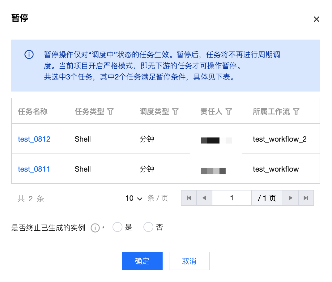 暂停 | 暂停:仅对任务状态为“调度中”的任务有效。暂停任务后,任务将不会产生新的实例,可在暂停操作时选择是否终止已生成的实例。 |