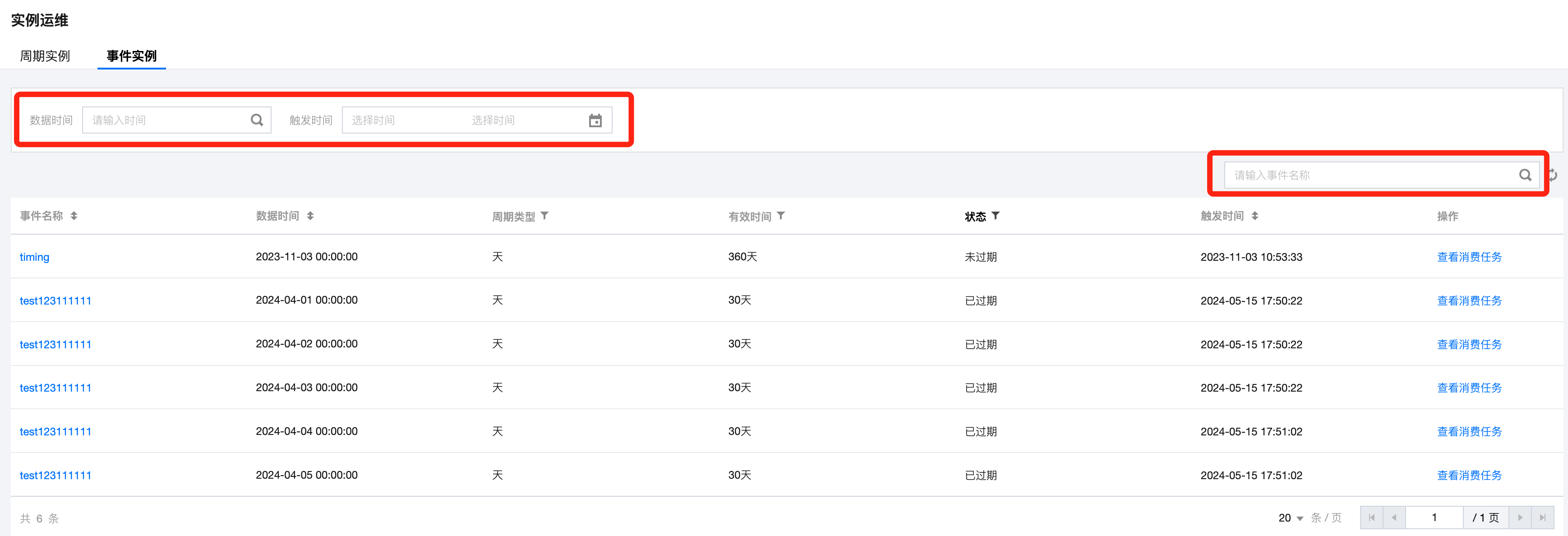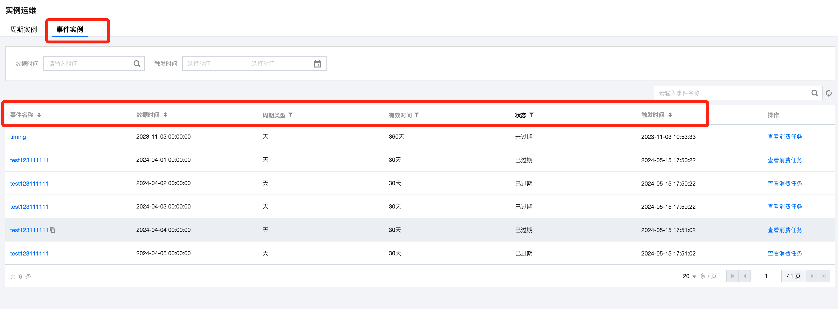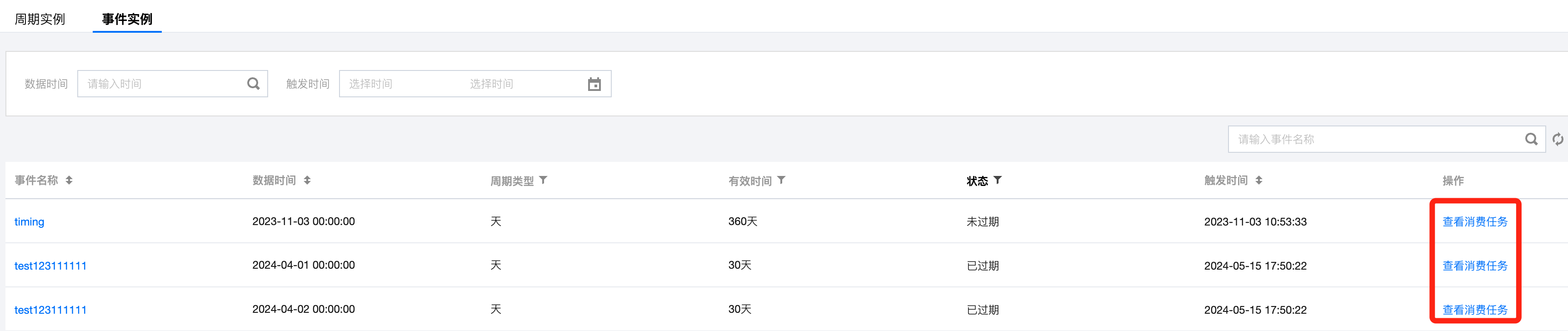 状态 | 显示事件实例的被消费状态,包括待消费、消费中、已消费、已过期。 |