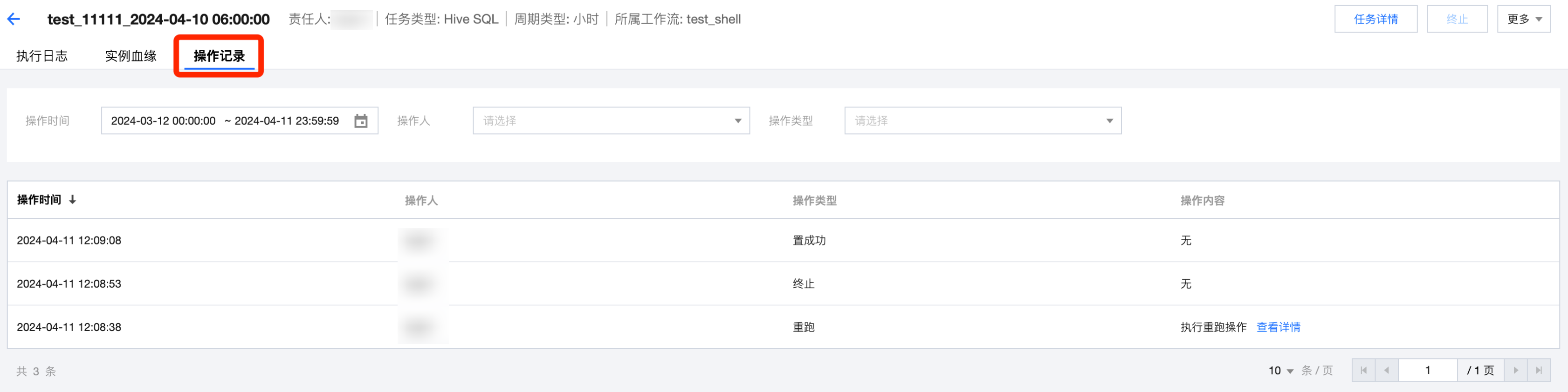 操作记录 | 查看对实例的操作记录,包含:置成功、终止、重跑等操作的操作人、操作时间等信息。 ![]() |