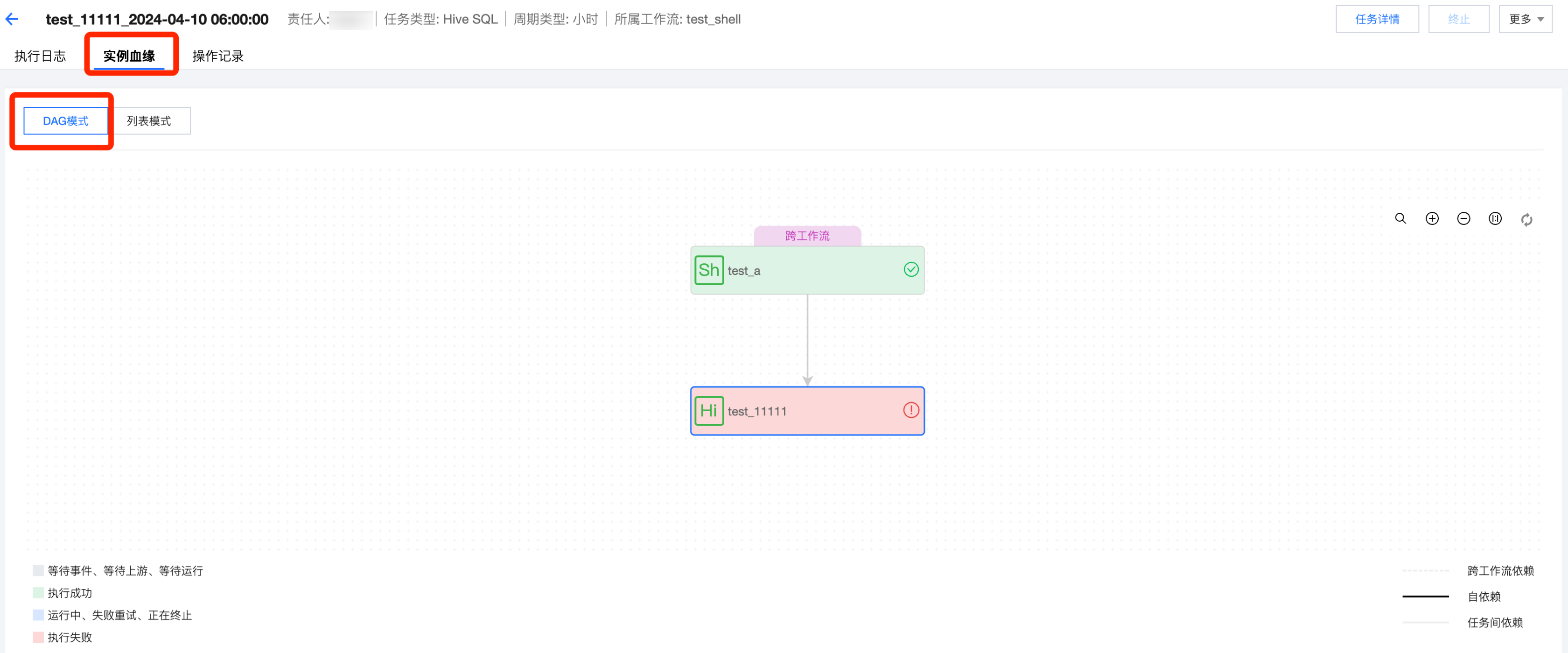 查看血缘 | 跳转到实例详情页 > 实例血缘,可查看实例的上下游关系,并支持在 dag 图上诊断上下游阶段进行简单的信息查看和操作。 |