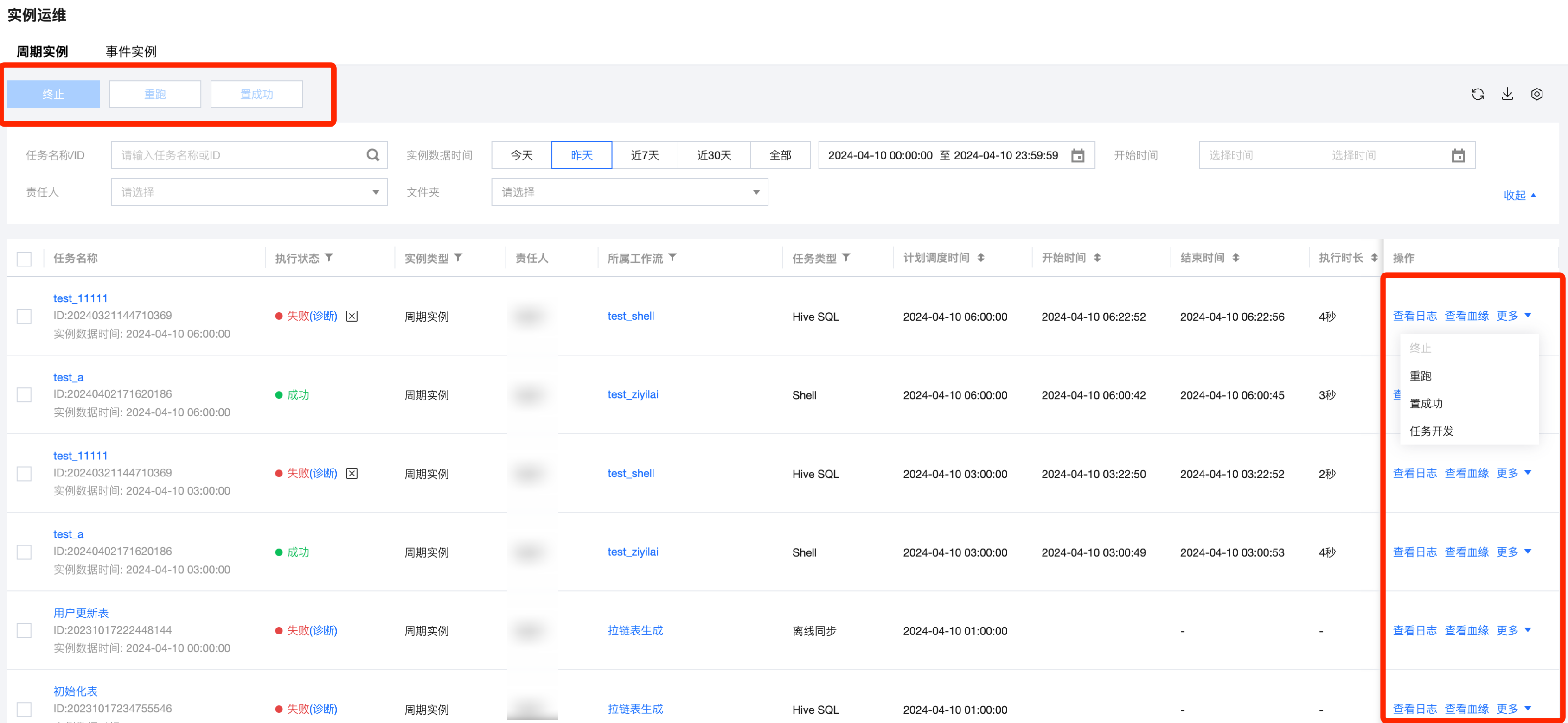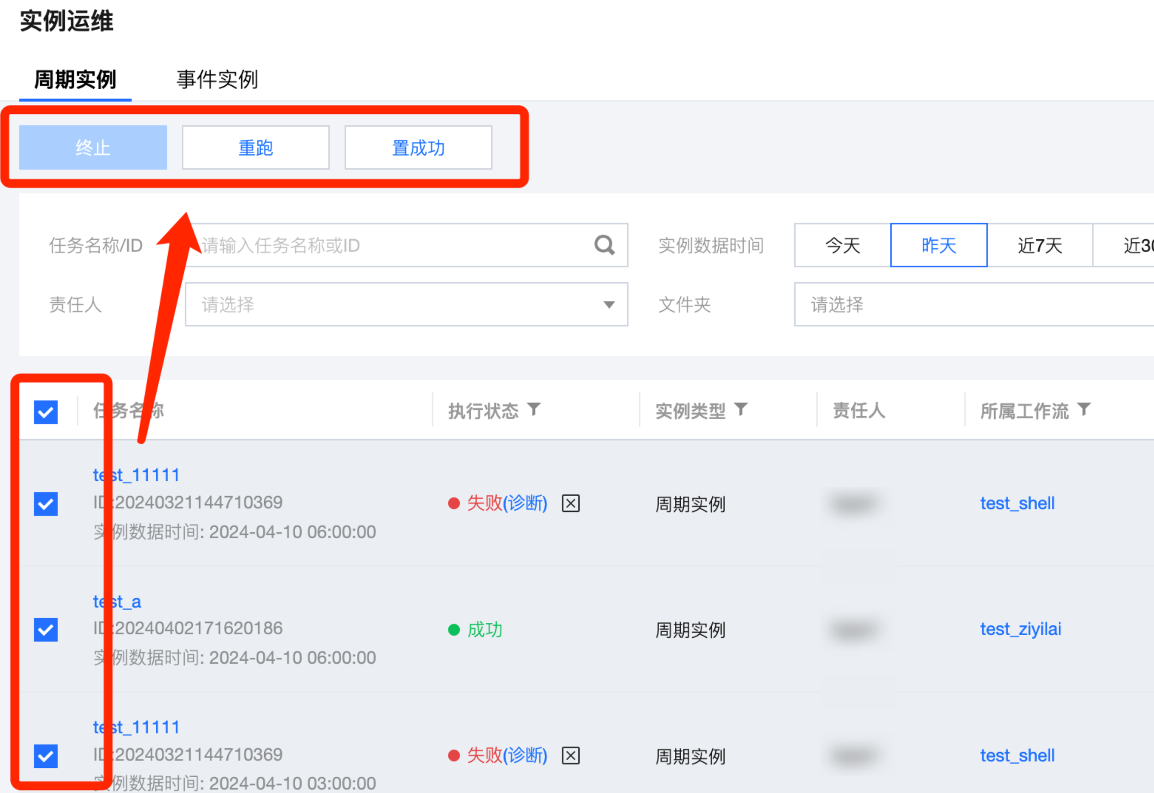 批量操作 | 在任务名称前进行勾选,再使用上方的功能按钮,可以批量将选中的周期实例执行终止、重跑、置成功的运行操作。 ![]() |