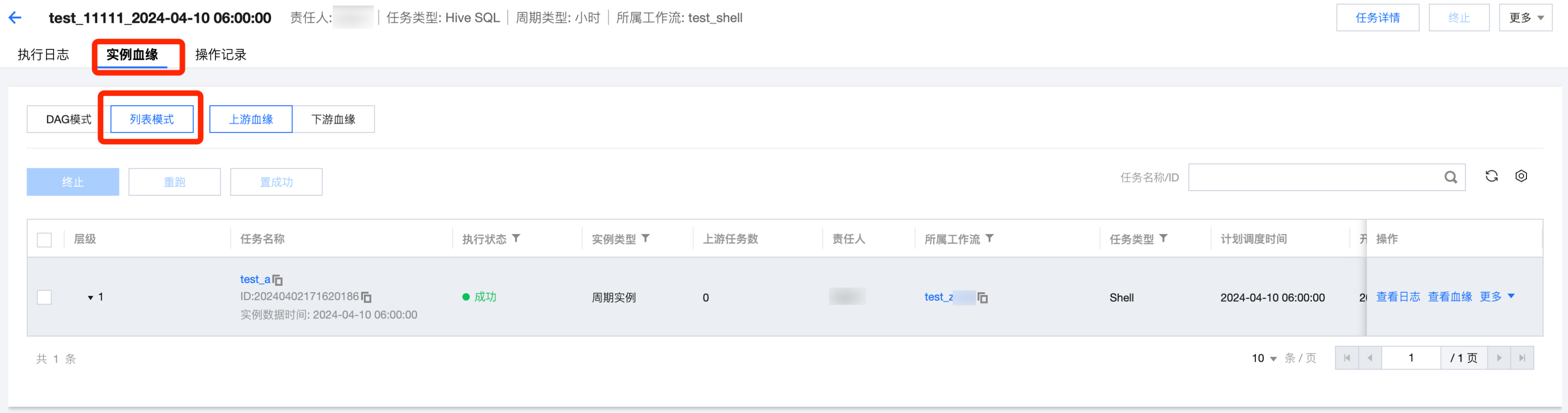 实例血缘 | 查看当前计算任务实例在其所属的工作流中与其他计算任务实例的上下游关系,并且会显示每个计算节点的运行状态与详细信息,用不同颜色标记实例运行状态。 图模式:通过图模式查看实例血缘,可逐层向上展开,支持实例基础操作。 ![]() 列表模式:通过列表模式查看实例血缘,可选择查看上游或下游。 ![]() |