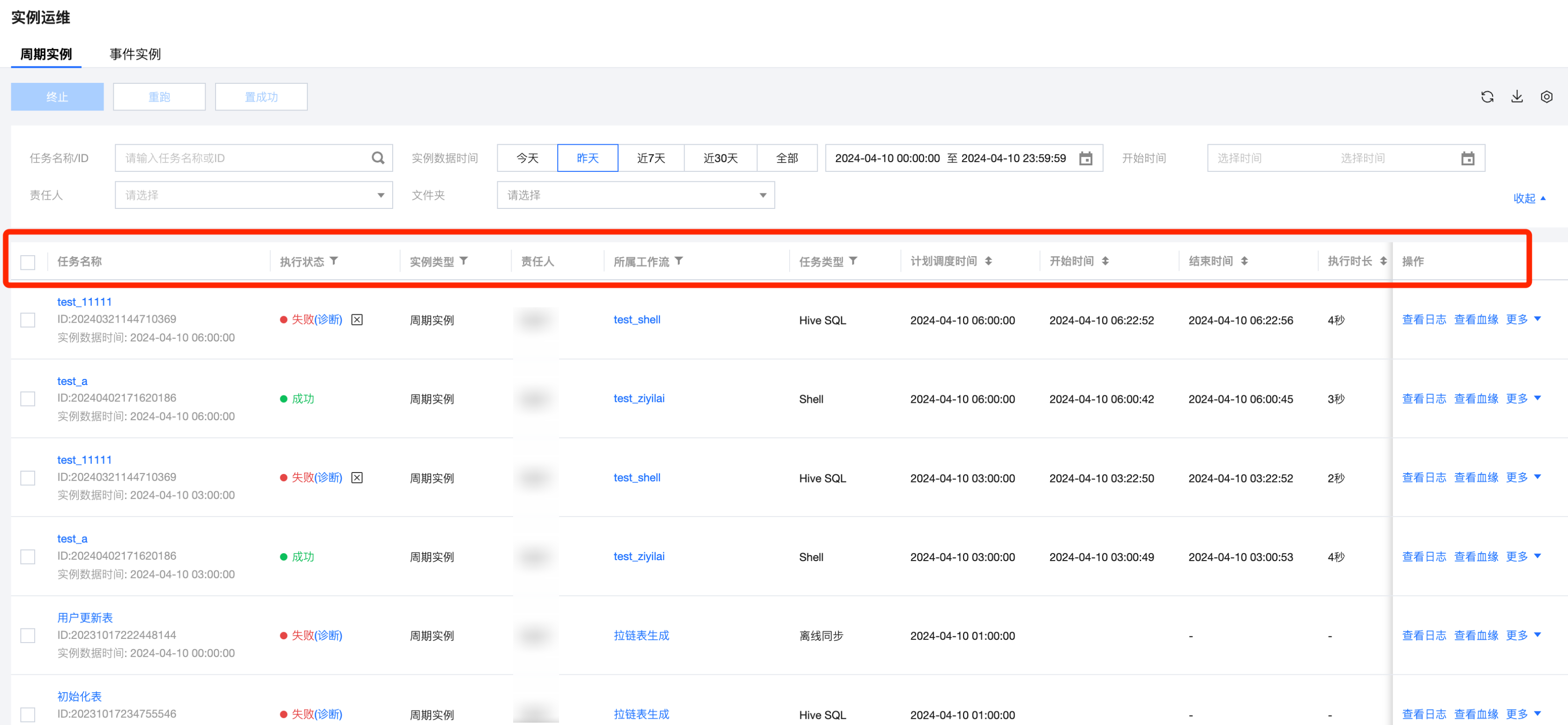 筛选项 - 列表上方 | 支持按照任务名称/ID、实例数据时间、开始时间、责任人、文件夹进行筛选。 |