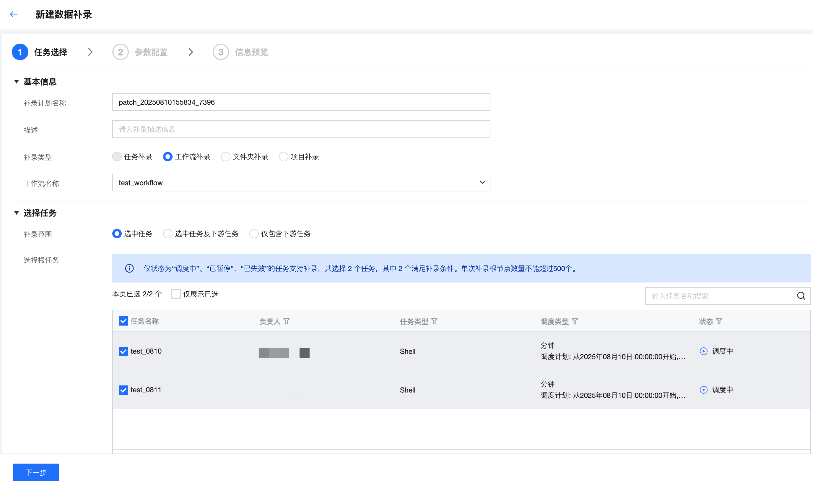 补录任务范围 | 选中任务:仅可在工作流或选中任务中选择。 选中任务及下游任务:可在工作流或选中任务及其下游任务中选择。 仅包含下游任务:仅可在工作流或选中任务的下游任务中选择。 注意: 仅状态为“调度中”、“已暂停”、“已失效”的任务支持补录。单次补录根节点数量不能超过500个,如果超出限制,请用户缩小选择范围。 |