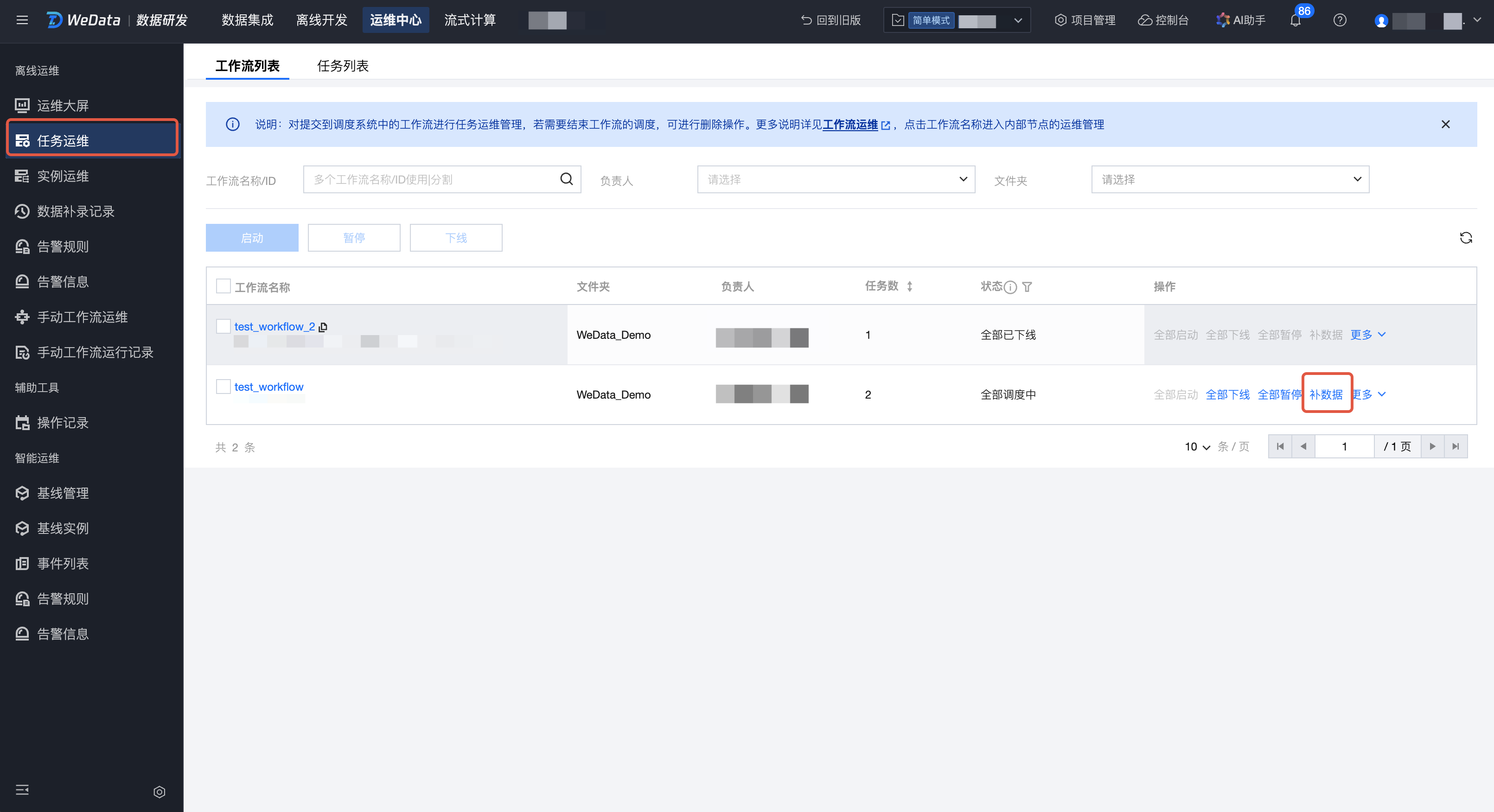 补录类型 | 任务补录:在任务列表执行补数据后默认选中,对选中任务作为候选。 工作流补录:在工作流列表执行补数据后默认选中,对选中工作流内任务作为候选。 文件夹补录:对编排空间中的文件夹内所有工作流内的任务作为候选。 项目补录:将当前项目下的所有任务作为候选。 |
