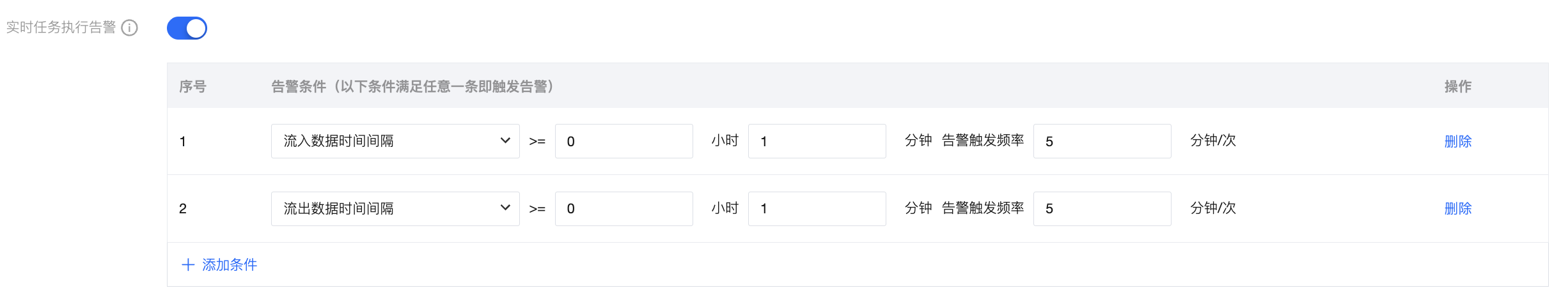 告警条件 (监控对象为实时任务) | 数据流入/流出时间间隔 | 当实时任务(DLC Spark Streaming)在预设时间内,流入/流出数据量持续为 0 时,系统将触发告警。告警推送的最小间隔,遵循配置的告警触发频率执行。 告警触发频率可配置范围:5-1440分钟 ![]() |