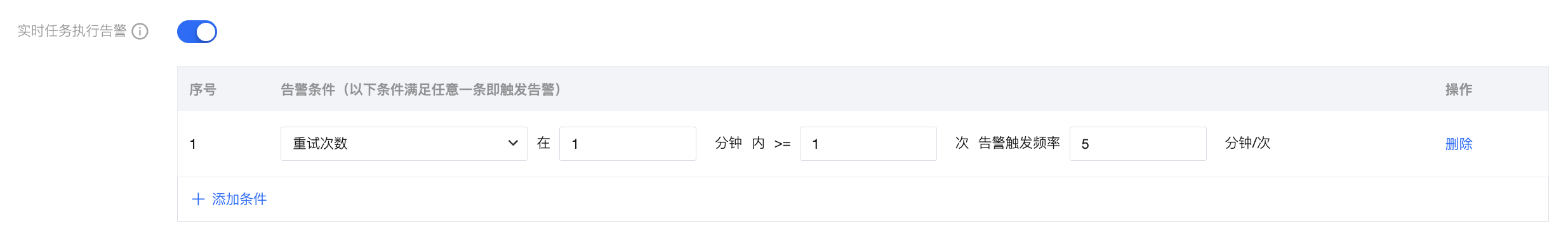 告警条件 (监控对象为离线任务) | 运行失败 | 被监控的任务生成实例运行失败时进行告警,支持针对周期执行或补录、重跑执行进行配置。可以选择“所有重试完成后失败”或“第一次运行失败”的规则触发条件。 所有重试完成后失败:根据计算任务调度策略中针对任务执行失败的情况,如果有失败重试的相关配置,则按照失败重试的次数执行后,实例均运行失败时,触发告警规则。 第一次运行失败:根据计算任务调度策略,第一次生成的实例运行失败后,触发告警规则。 ![]() ![]() |