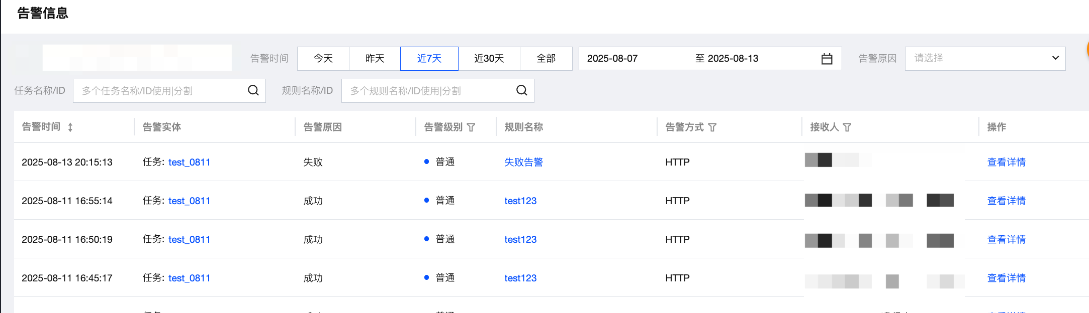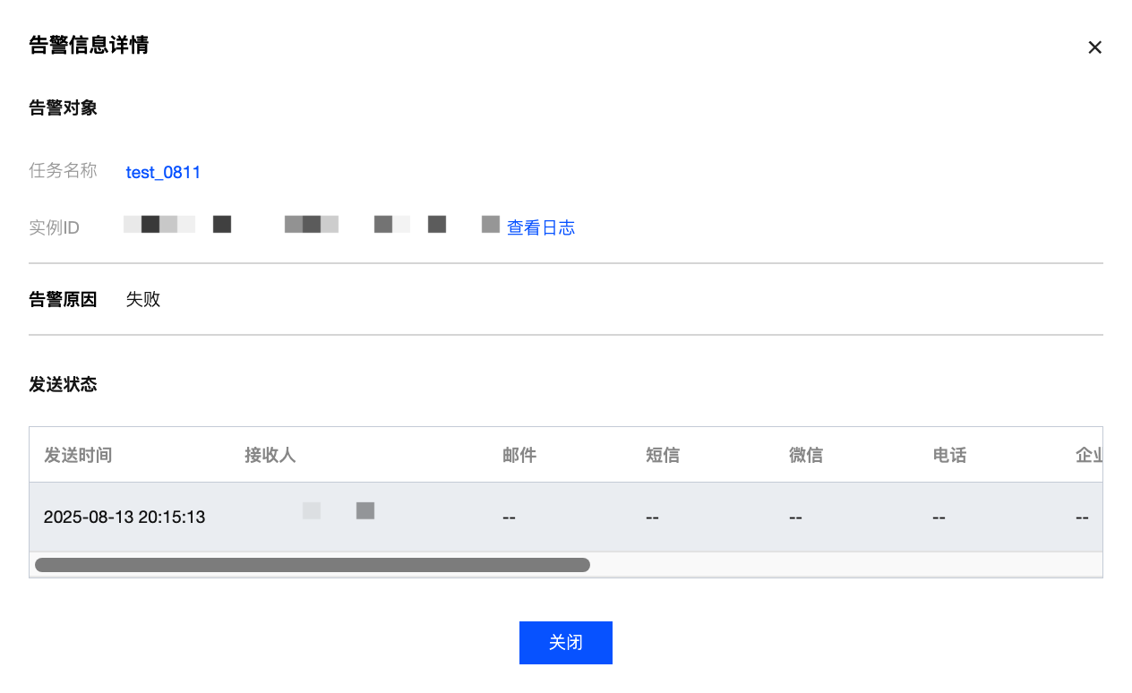 告警任务 | 显示触发告警信息的任务实例名称与实例 ID。单击实例名称可以跳转到对应实例的管理页面。 ![]() |