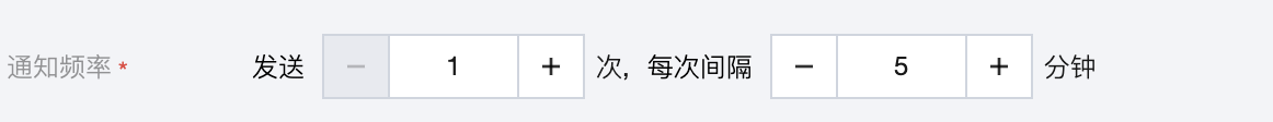 | 通知频率 | 支持定义一次告警的发送次数,及每次发送消息之间的间隔时间。若至少配置了一个告警升级人,则不支持配置通知频率,仅显示告警间隔。 ![]() |