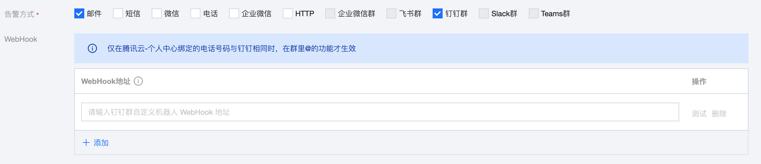 | 告警方式 | 告警规则触发后,告警信息的发送渠道。目前支持邮件、短信、微信、电话、企业微信、HTTP、企业微信群、飞书群、钉钉群、Slack 群、Teams 群等推送方式。手机、微信、邮件等账号可以在腾讯云个人中心 > 访问管理 > 用户模块中配置,企业微信账号在腾讯云个人中心 > 访问管理 > 联合账号中配置。企业微信群、飞书群、钉钉群、Slack群和Teams群只能选择一个。 ![]() |