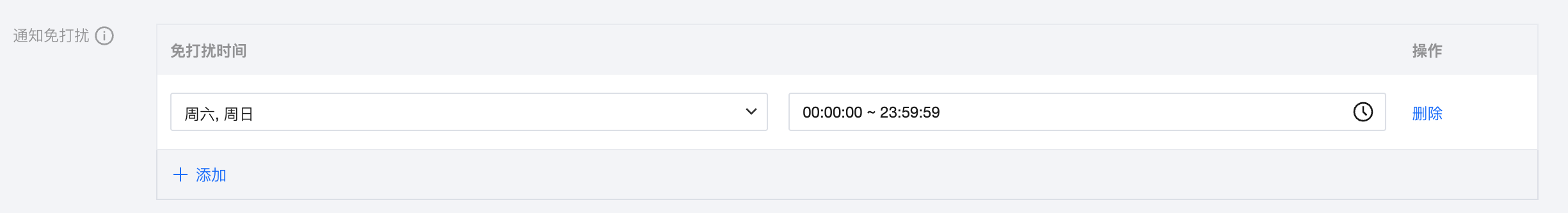 | 通知免打扰 | 支持设置通知的免打扰时间,免打扰时段内告警将不会发送,用户可以在告警信息中查看到告警记录。 免打扰支持按照星期、时间进行配置,支持配置多段免打扰时间。 ![]() |