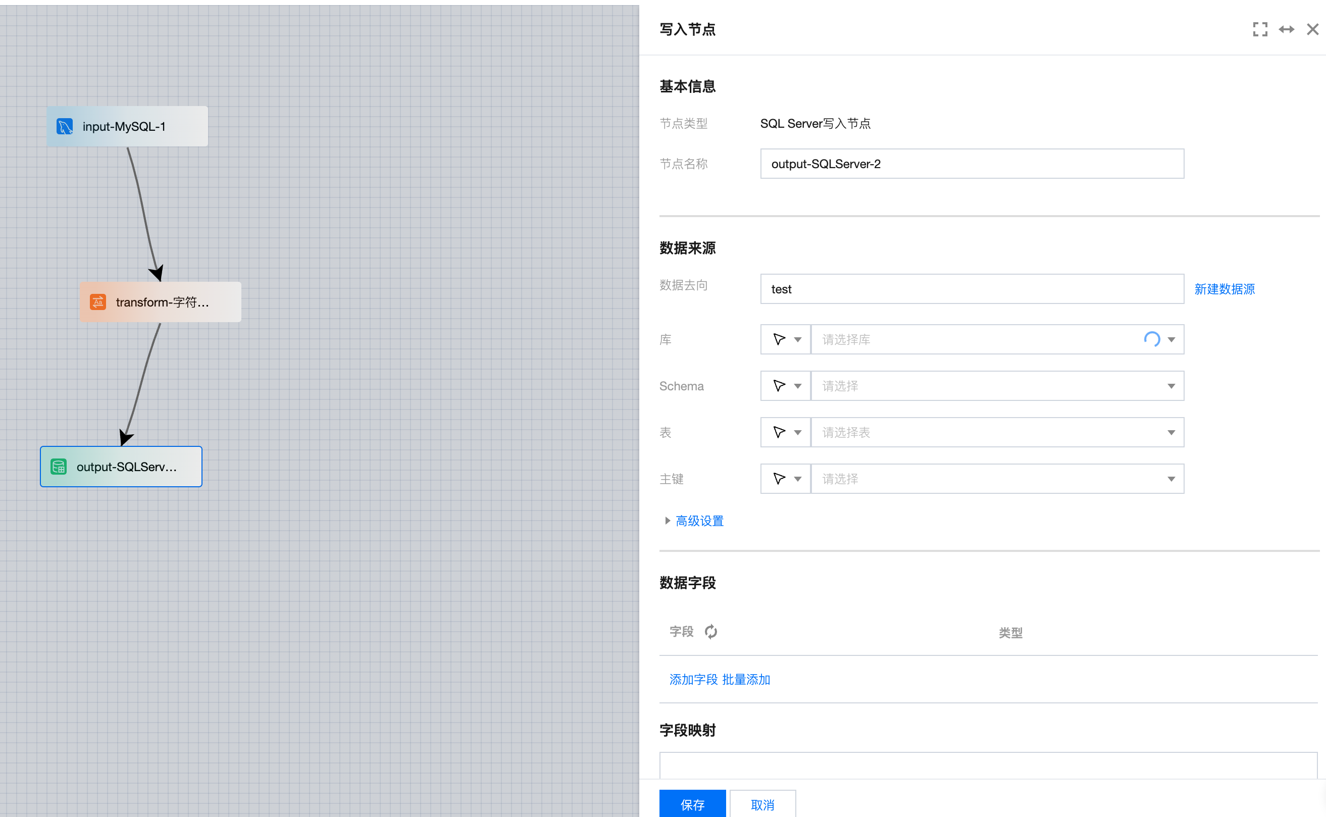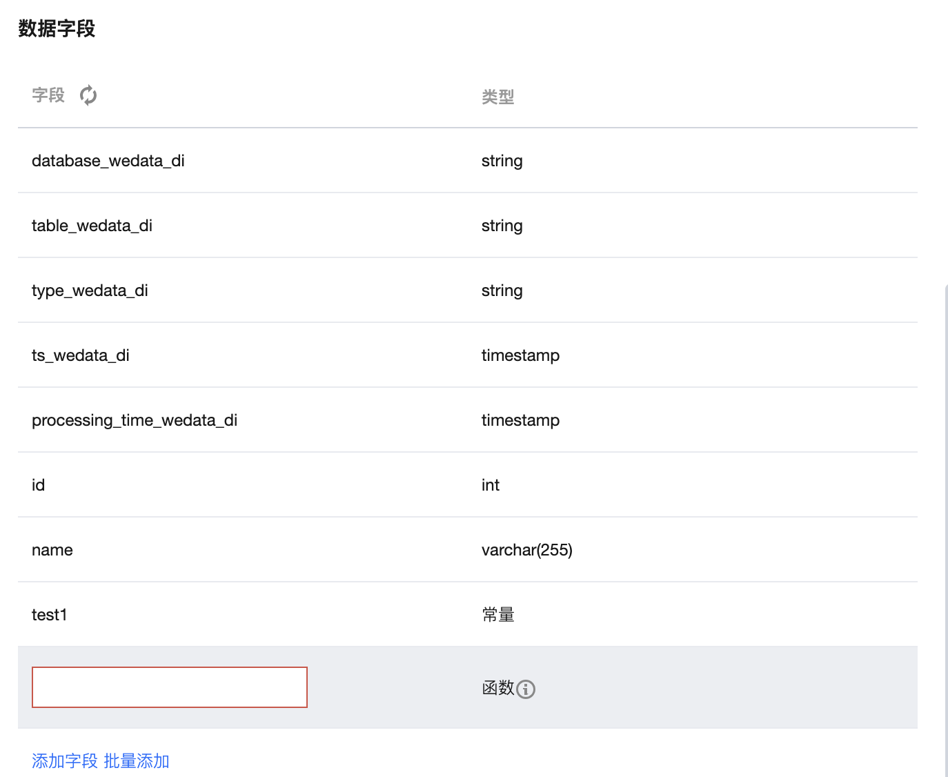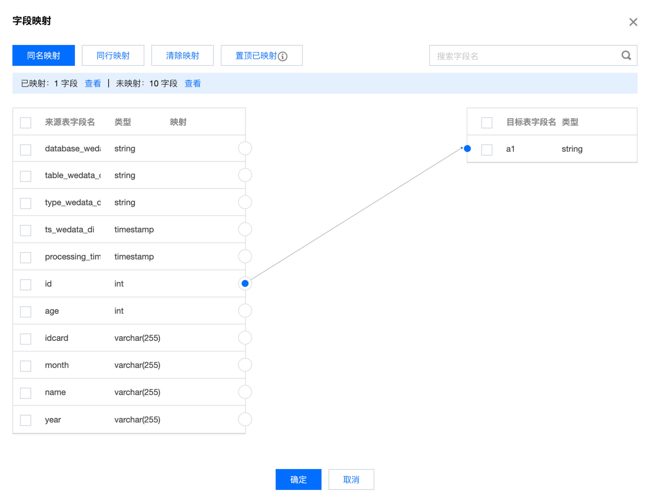 | 2-2 | 字段映射:设置来源和目标端数据对应关系,后续任务仅同步具有映射关系的字段之间的数据。 说明: 部分非关系型数据库无法自动获取字段信息,需手动逐个添加字段或批量添加字段。 |