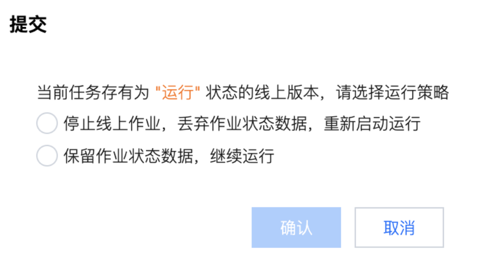 2 | 提交 | 将当前任务提交至生产环境,提交时根据当前任务是否有生产态任务可选择不同运行策略。 若当前任务无生效的线上任务,即首次提交或线上任务处于“失败”状态,可直接提交。 若当前任务存在“运行中”或“暂停”状态的线上任务需选择不同策略。停止线上作业将抛弃之前任务运行位点,从头开始消费数据,保留作业状态将在重启后从之前最后消费位点继续运行。 ![]() 说明: 单击立即启动任务将在提交后立即开始运行,否则需要手动触发才会正式运行。 |