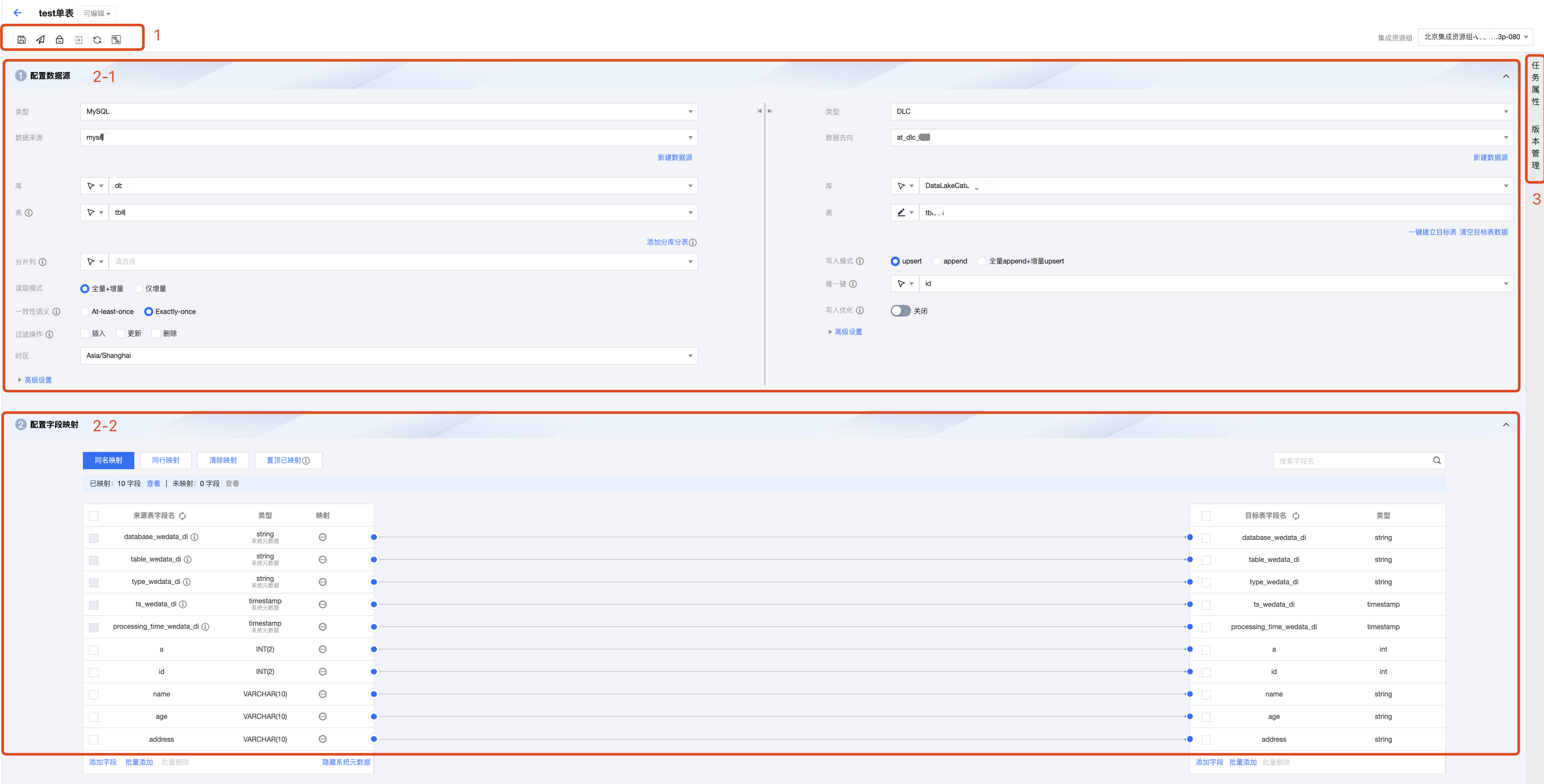 | 3-2 | 任务配置,此配置信息对全局任务生效: 实时任务包括任务属性、版本管理配置,提供任务资源并行度、CU 用量配置等。 |