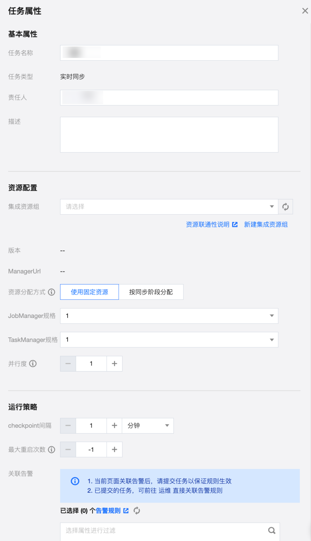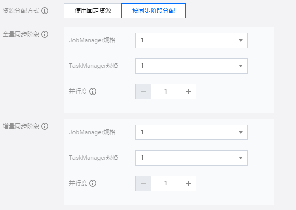 | 资源分配方式 | 集成资源支持多种分配方式: 固定分配:此方式下不区分任务同步阶段,全量及增量同步过程中始终为当前任务分配固定资源量。此方式可避免任务间资源抢占,适用于任务运行过程中数据可能存在较大变动的场景。 按同步阶段分配:按全量和增量不同同步阶段分配计划的资源使用量,以节约整体资源用量。 ![]() |
