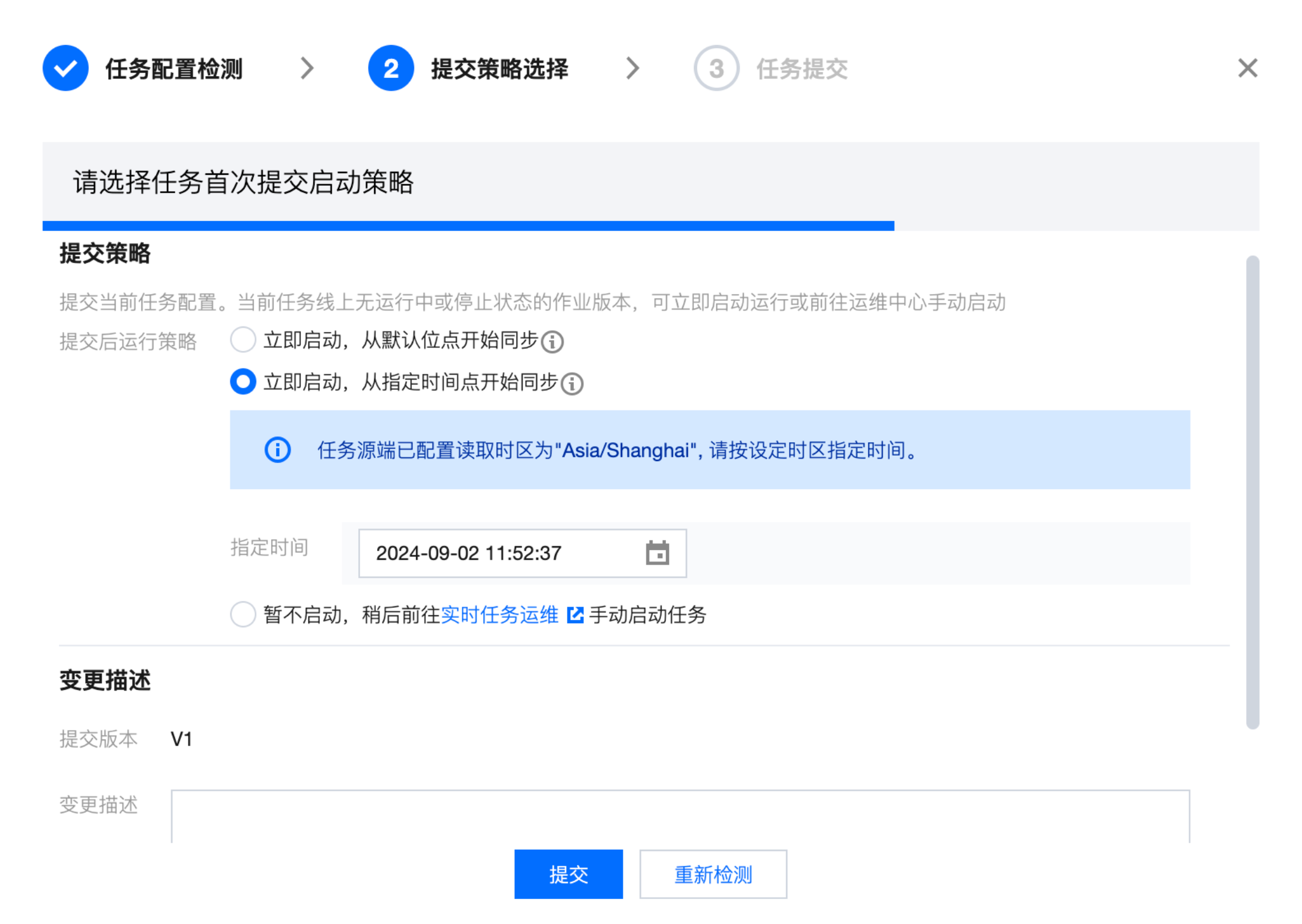 | 立即启动,指定时间点开始同步 | 此策略下需选择具体的开始时间,根据时间匹配位点。 1. 从指定时间点开始读取数据。若未匹配到指定位点,任务则默认从binlog最早位点开始同步 2. 若您源端读取方式为全量 + 增量,选择此策略将默认跳过全量阶段从增量的指定时间位点开始同步 |