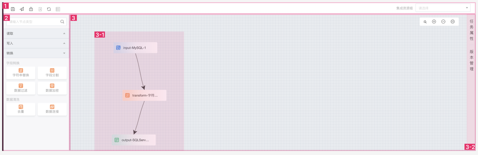 3 | 3-1 | 数据链路。由读取、写入、转换节点及节点间连线构成的数据链路,代表了同步任务内数据流向。 |