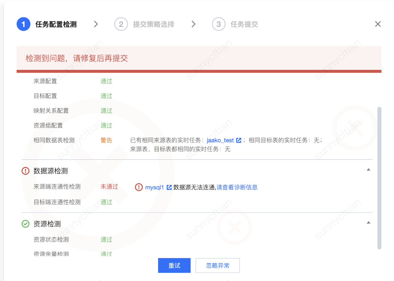 | 资源余量检测 | 检测资源组当前剩余的资源是否满足任务配置的资源需求。若检测不通过,请适当调小任务资源配置或扩容资源组。 |