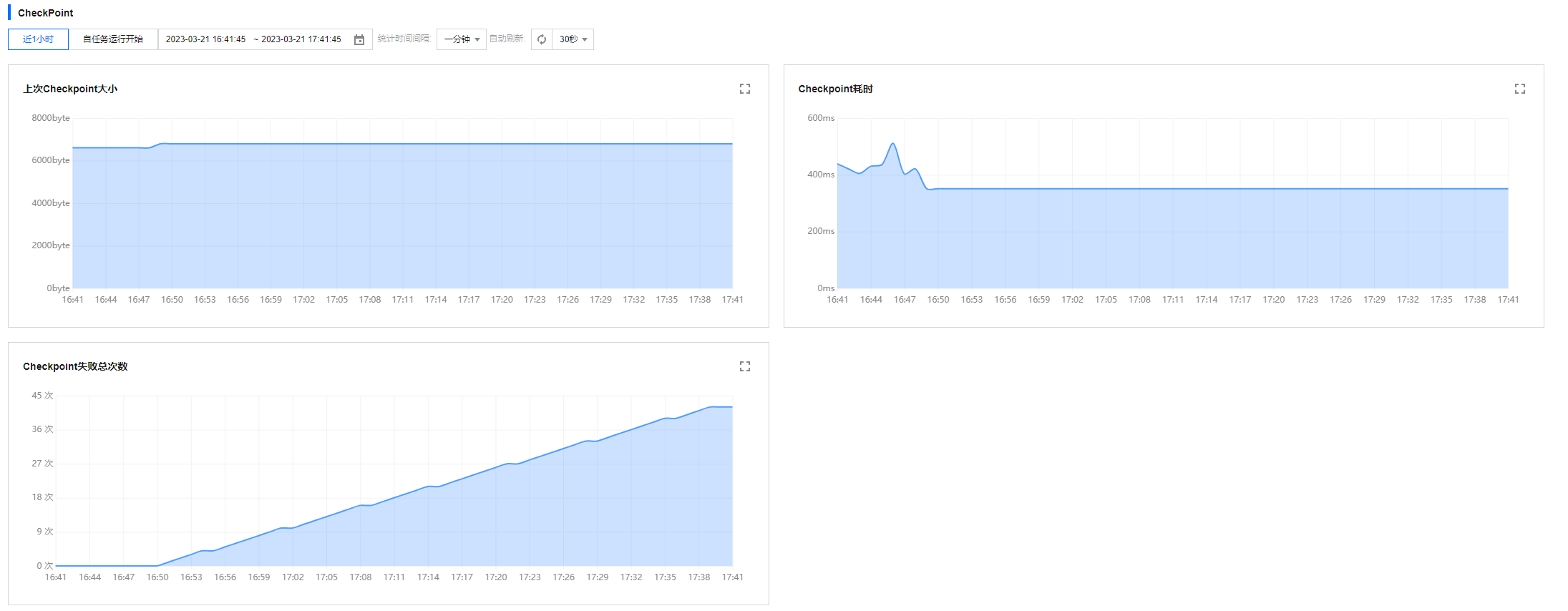 上次 Checkpoint 大小 | 当前作业最近一次的 Checkpoint 大小 | 751321.00Bytes |