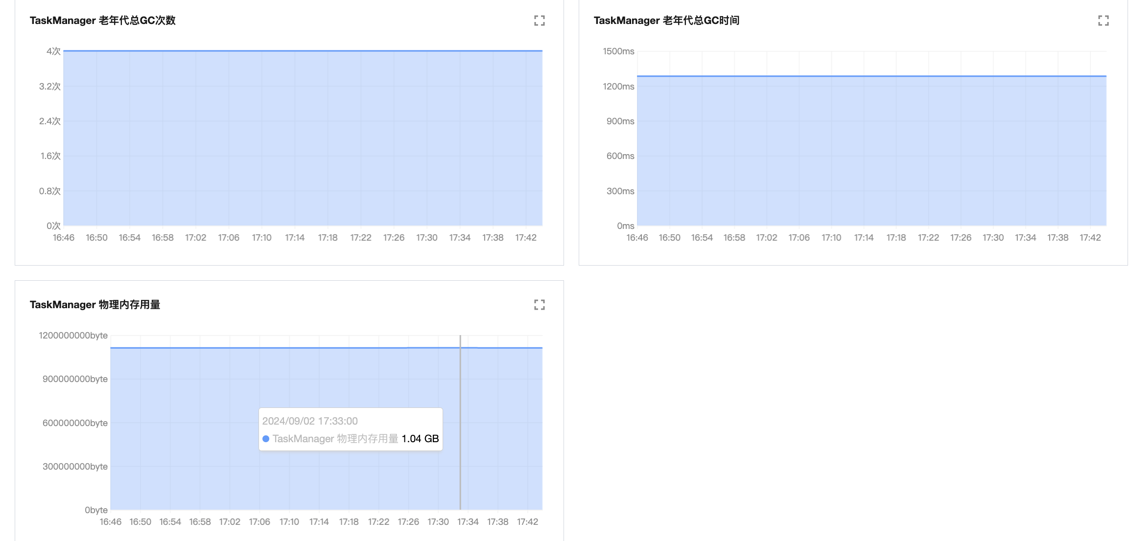 TaskManager 物理内存用量 | 当前作业 TaskManager 所在的 JVM 的物理内存用量(RSS),包括堆内、堆外、Native 等所有区域的总内存用量。 | 3597035110.00Bytes |