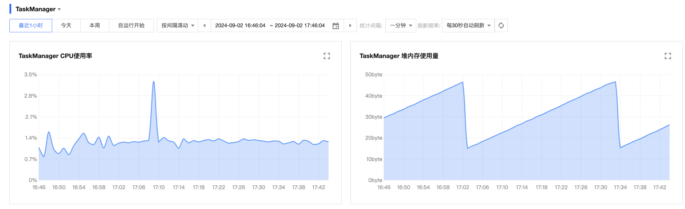 TaskManager 堆内存使用量 | 当前作业 TaskManager 堆内存的用量。 | 1040001560.00Bytes |