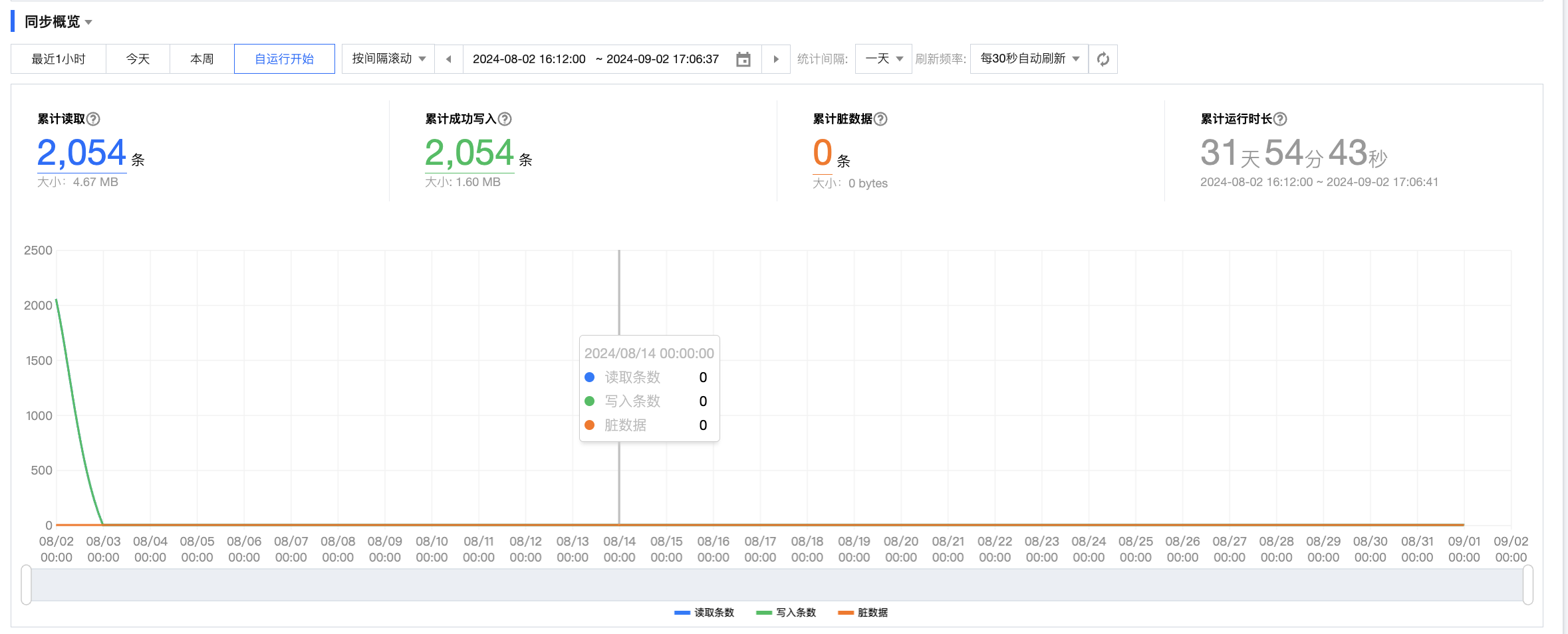 累计读取 | 本次任务运行期间,从来源端实际读取数据条数。此指标不包含筛选过滤等方式剔除的数据总量。 |