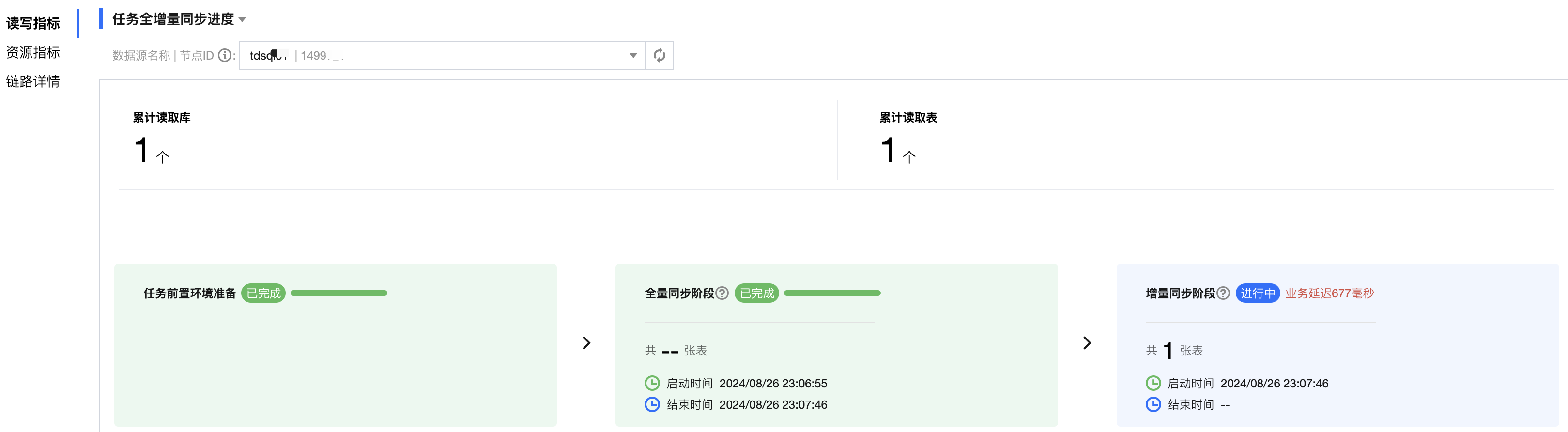 全量同步阶段 | 读取源端库表中的所有存量数据 | 本阶段内仅统计和展示读取成功且有存量业务数据的表数量,展示全量启动时间、全量结束时间,以及本阶段具体的进度(百分比)和状态(未启动/进行中/已完成) |