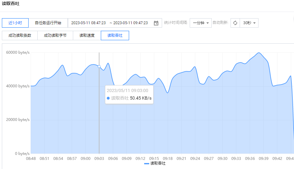 反压指标 | 该指标体现了读取端和写入端的相对速度,0.5%以下说明读取端比写入端比慢,0.5%以上说明读取端比写入端快 |