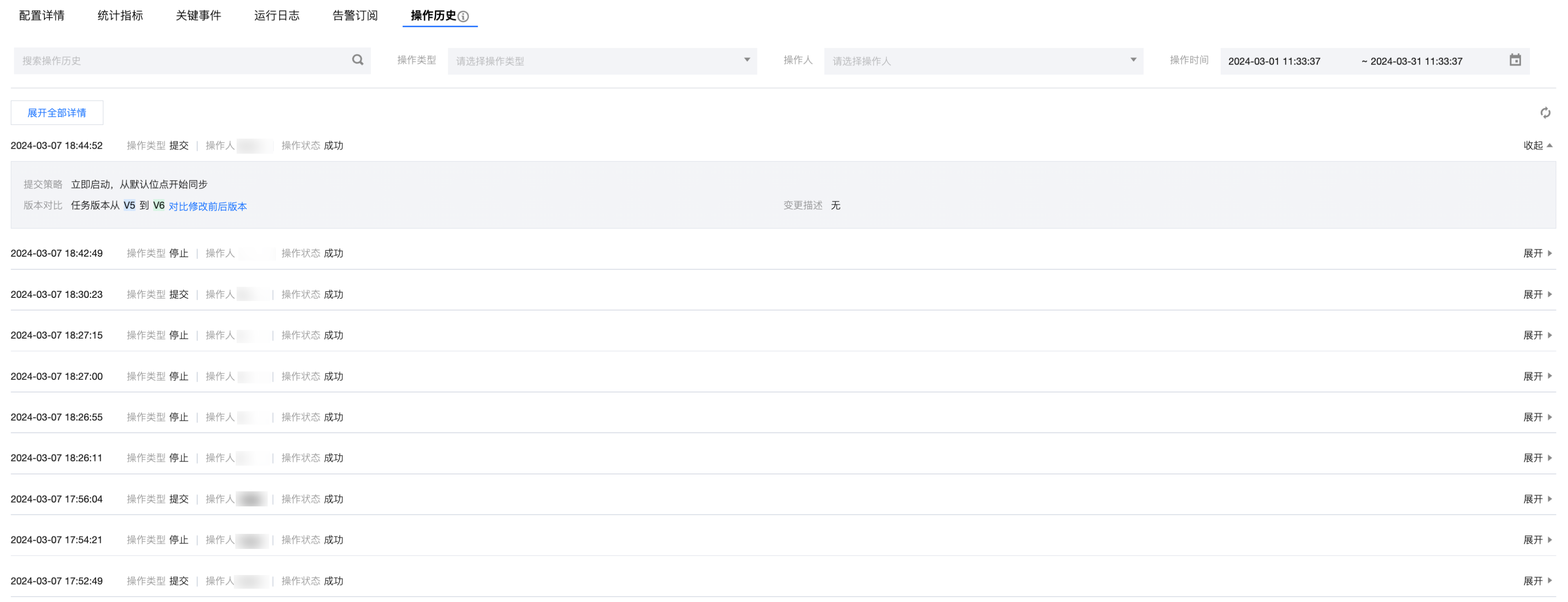 在操作历史中查看实时运维页面非查询类的所有页面操作,实时运维界面支持从任务记录列表,单击