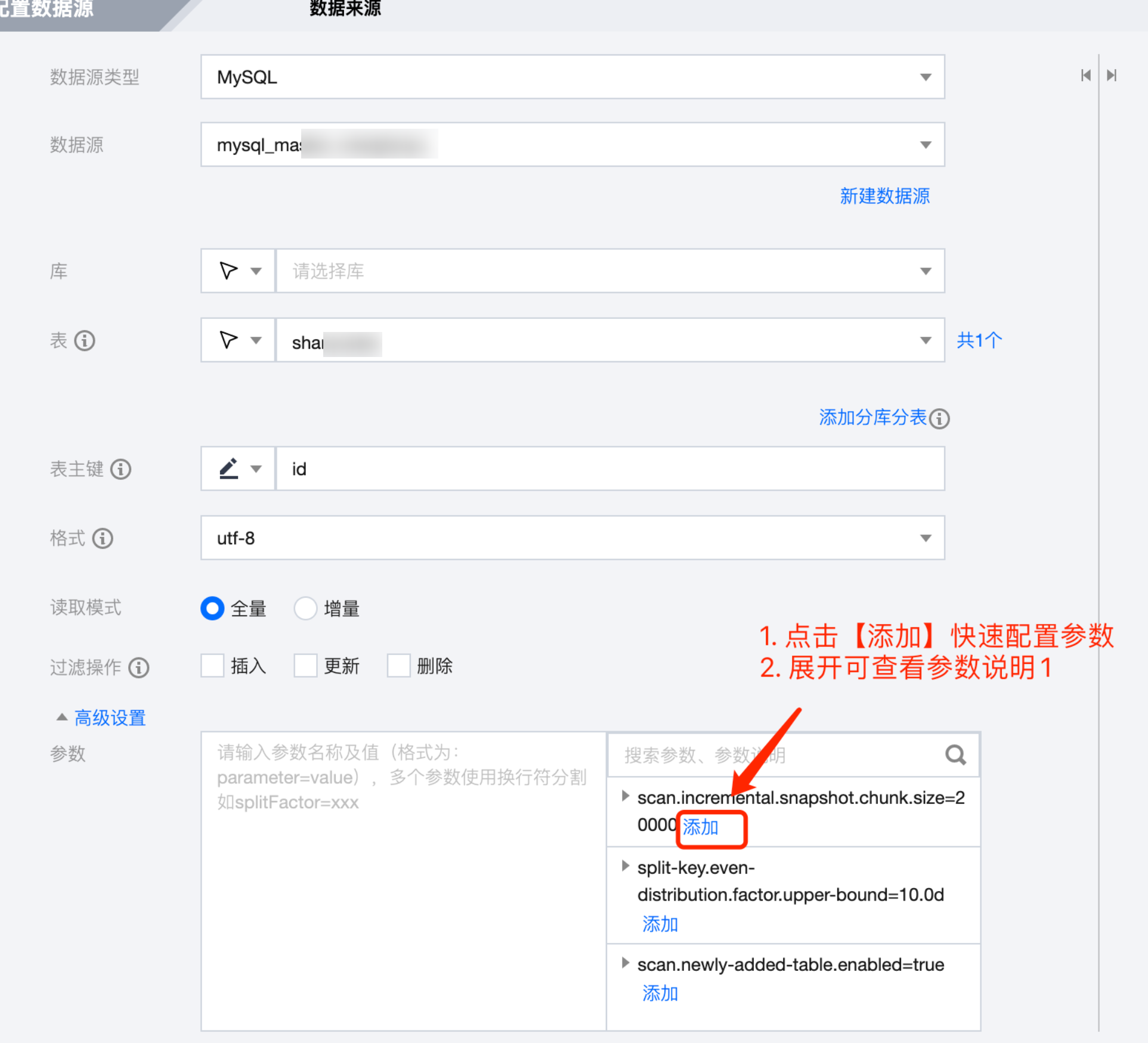 Mysql / tdsql-c Mysql | 节点级别 | 读 | 单表+整库 | scan.newly-added-table.enabled=true | 参数描述 : 设置这个参数,在暂停 > 继续后可以感知新增的表。默认是 false 1. 全增量同步时使用该参数,新增的表会读取存量数据后再读取增量数据 2. 增量同步时使用该参数,新增的表只会读取增量数据 |