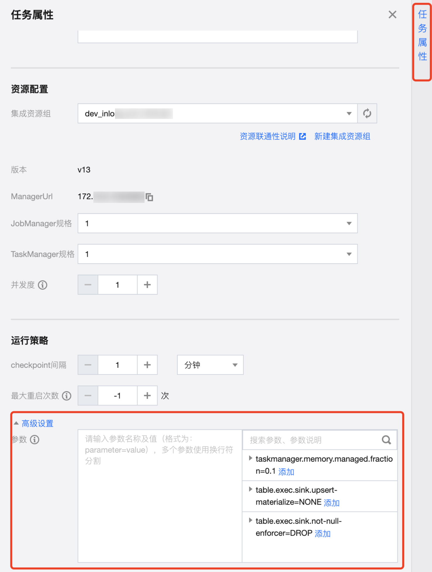 | | - | - | table.exec.sink.not-null-enforcer=DROP | 参数描述 : 决定当 NOT NULL 字段遇到 null 值时任务如何处理 建议值及作用: 1. ERROR:NOT NULL 字段遇到 null 值时抛出运行时异常。 2. DROP:NOT NULL 字段遇到 null 值时直接丢弃数据 |