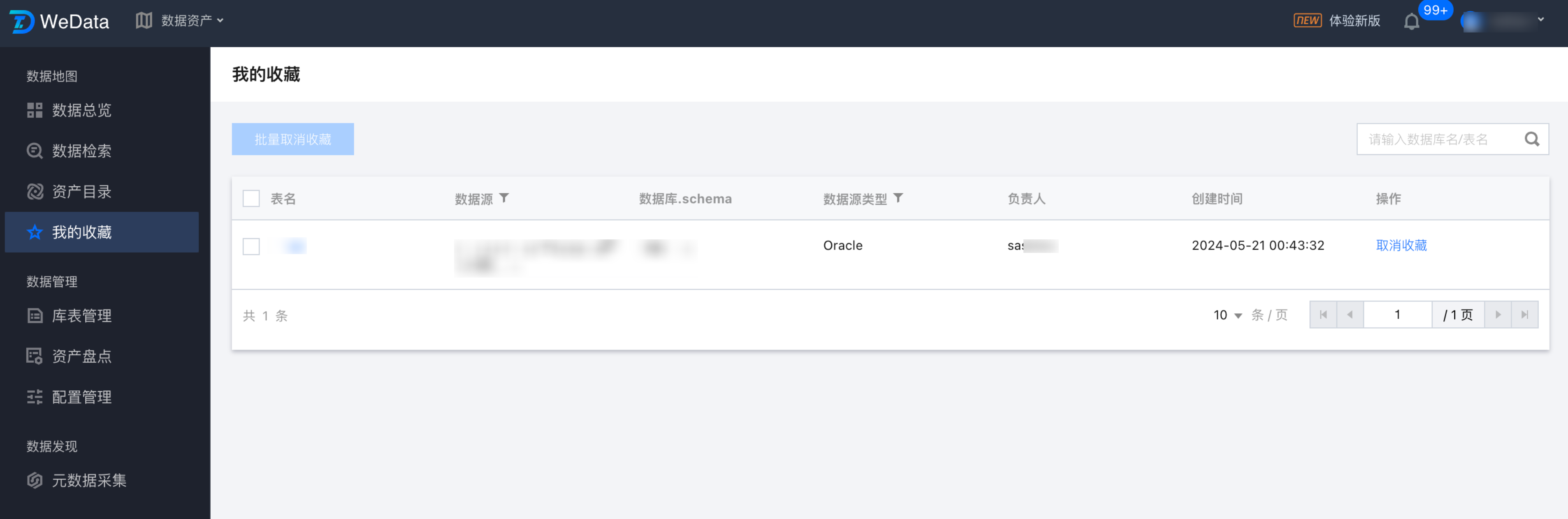在我的收藏界面主要展示用户主动收藏的数据集,包括数据表名称、数据源、数据库、表类型、表负责人、创建时间及操作(支持取消收藏)。