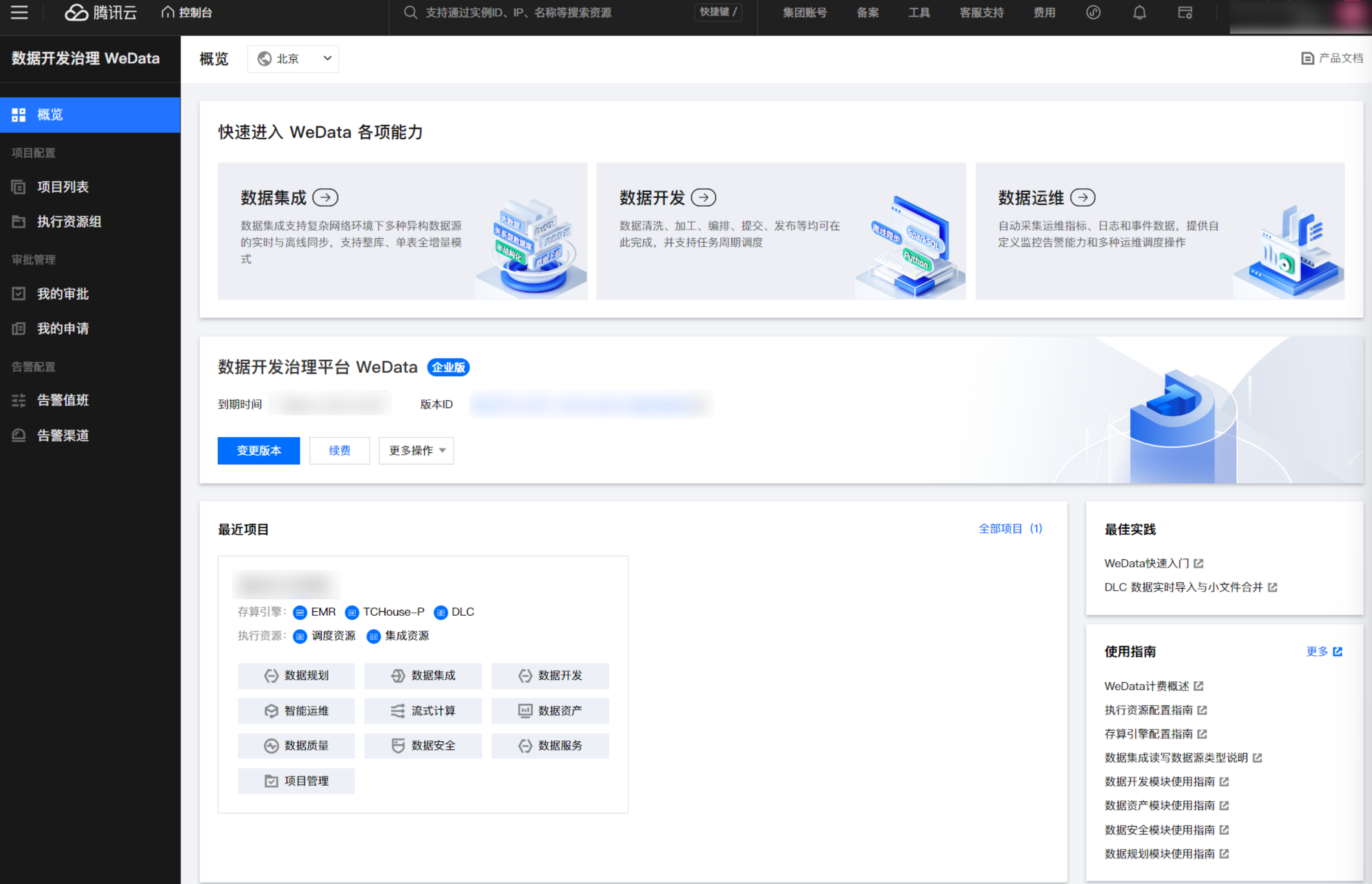管理控制台是用户腾讯云官网进入 WeData 的第一个页面,承载着租户(主账号)下所有 WeData 相关资产信息的概览和入口,帮助租户统一管理查看资产信息,快速了解产品特性并进入工作流程。本模块包括:概览、项目列表、执行资源组、审批管理、告警配置。