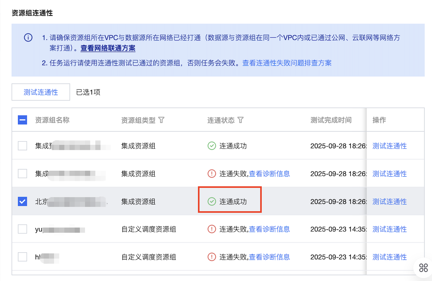 5. 在测试连通性中,可以测试调度资源组、集成资源组与数据源的连通性。如果在 Private DNS 中配置了相关域名的解析记录,则可以连通成功。