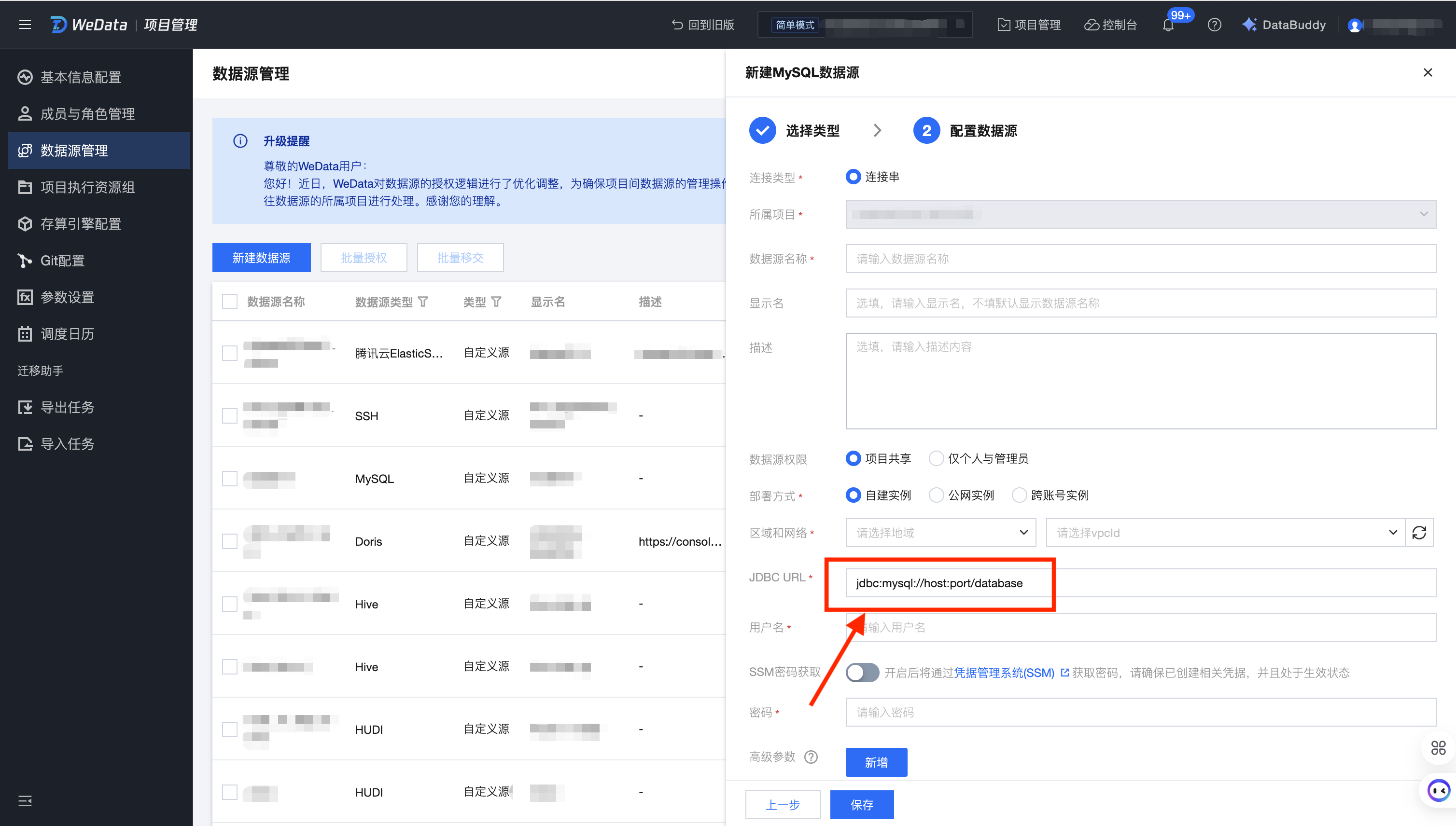 4. 在项目管理 > 数据源管理中新建数据源,JDBC URL可以输入域名。