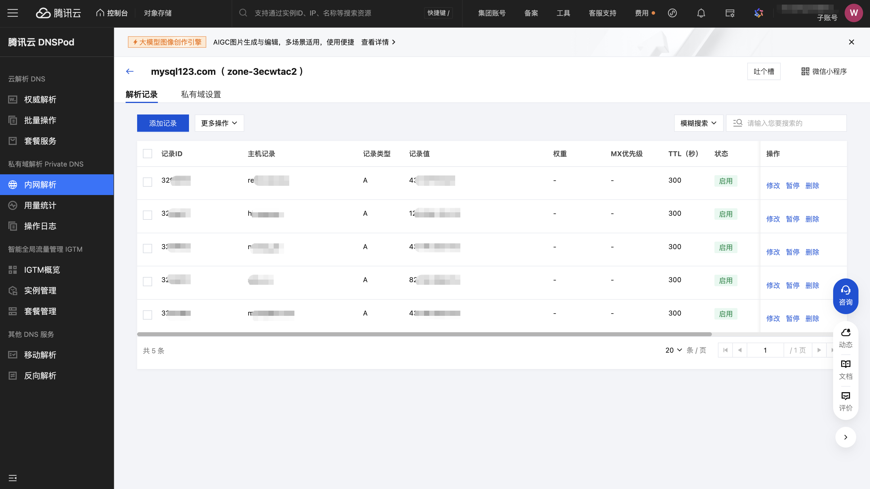 3. 在 DNS 配置中,选择 DNS 策略为腾讯云 Private DNS。单击确定后会重启该资源组。