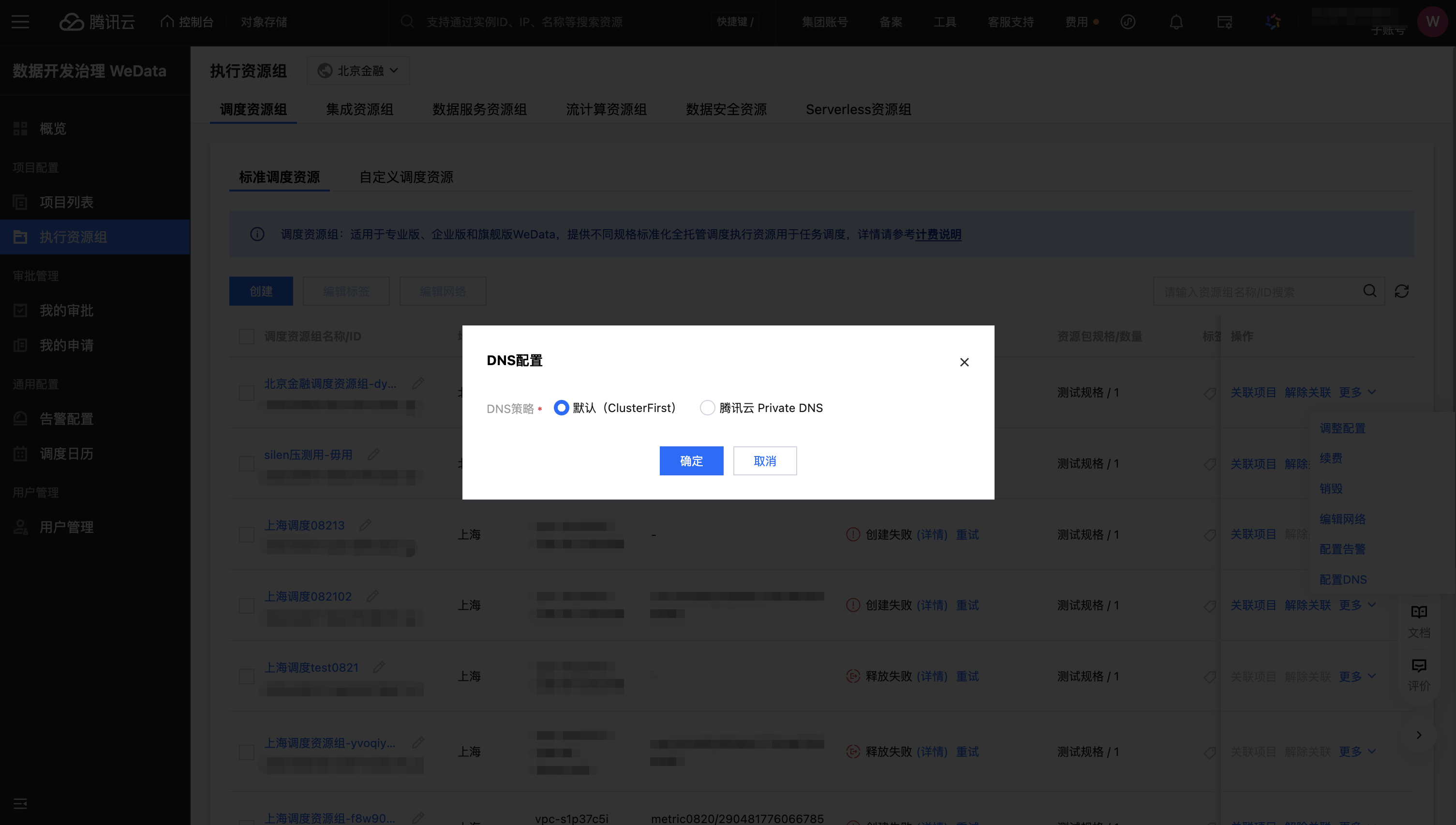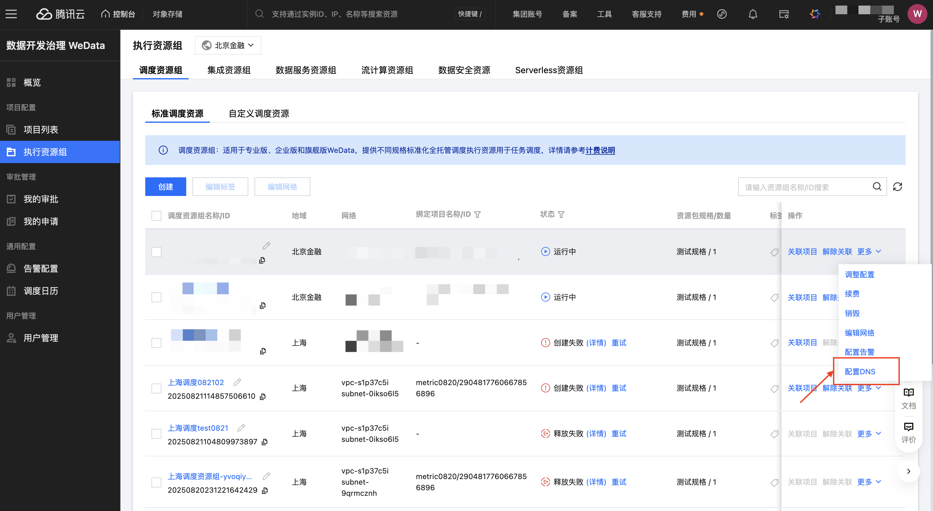 2. 进入 WeData 控制台 > 执行资源组,单击操作 > 更多 > 配置DNS。