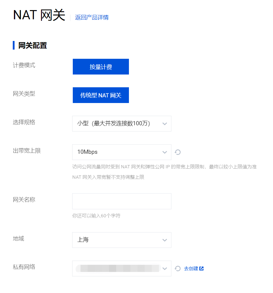 1. 进入腾讯云私有网络 > NAT 网关。在对应地域单击新建 NAT 网关。 2. 购买 NAT 网关: