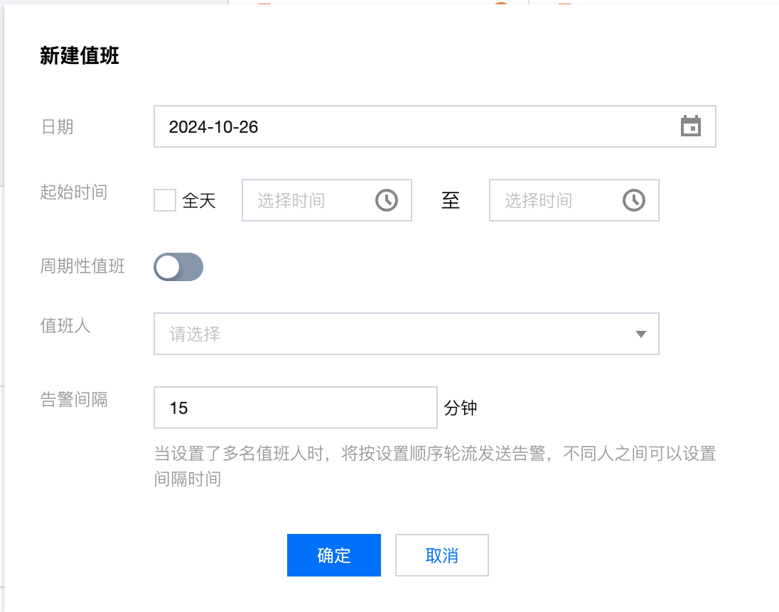 起始时间 | 值班人的值班时间,可选全天或指定一天内的时间段 |
