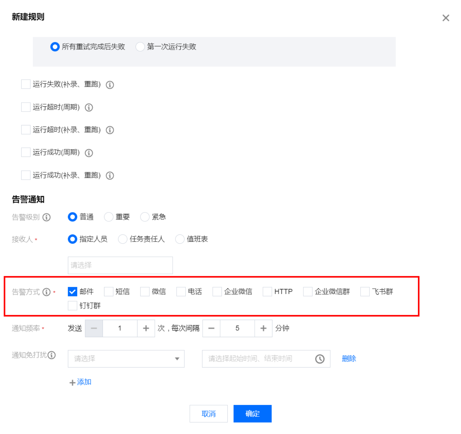 告警间隔 | 当设置了多名值班人时,将按设置顺序轮流发送告警,不同人之间可以设置间隔时间 |